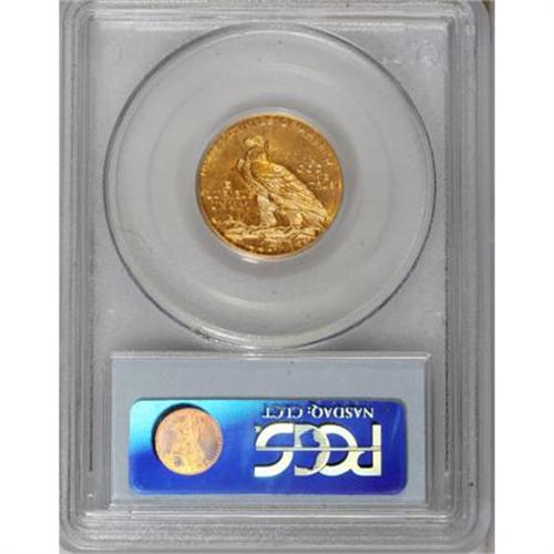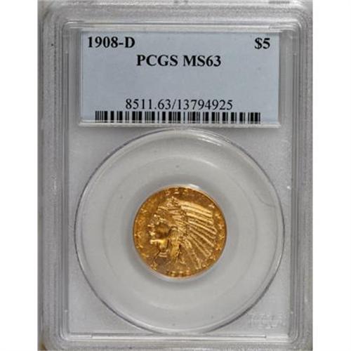 <B>1908-D $5 MS63 PCGS.</B></I> The centers of this exceptionally lustrous D-mint half eagle are lemon-gold, while the margins range from rich orange-gold to mint-green. A solidly struck first-year example that shows only faint abrasions.<BR><BR><B>Coin Engraver:</B> Bela Lyon Pratt<BR><BR><b>Shipping:</b> Coins & Currency (<a target="_blank" href="http://www.heritageauctions.com/common/shipping.php">view shipping information</a>)