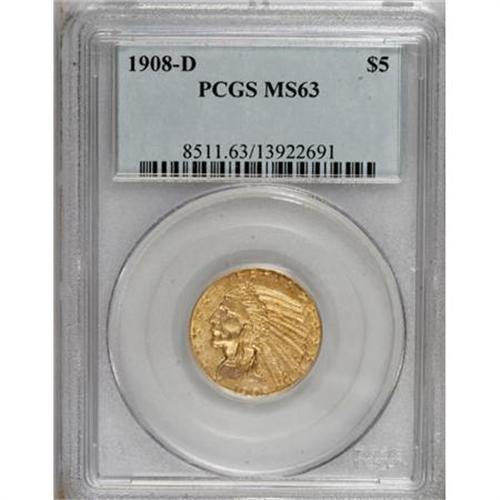 <B>1908-D $5 MS63 PCGS.</B></I> This almond-gold survivor is from the first year of Indian Head half eagle production at the Denver Mint. Bold mint luster and sharply struck design elements are evident on both sides. Minor surface marks define the grade. <BR><BR><B>Coin Engraver:</B> Bela Lyon Pratt<BR><BR><b>Shipping:</b> Coins & Currency (<a target="_blank" href="http://www.heritageauctions.com/common/shipping.php">view shipping information</a>)