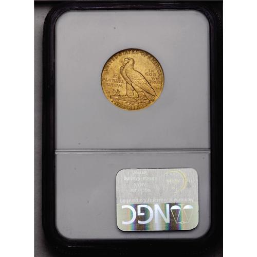 <B>1908-D<$5> MS64 NGC.</B></I> A popular first year of issue and more colorful than the usually encountered gold coin. While the greater part of this near-Gem specimen exhibits deep orange toning, blushes of rose patina are evident peeking around the devices. We note a few minor abrasions, but nothing out of the ordinary for a coin that the Mint produced without a protective rim. An attractive piece for those who prefer their coins to stand out in a crowd.