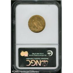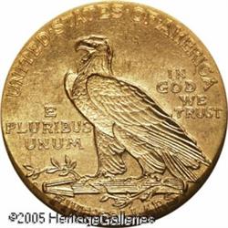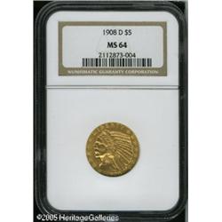 <B>1908-D $5 MS64 NGC.</B></I> Pleasing honey-gold patina reveals subtle light green undertones, and the design elements are adequately impressed, though the hair at the Indian's temple is soft. Light contact marks in the obverse and reverse fields limit the grade. Lot:8676