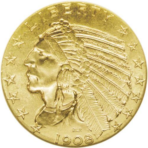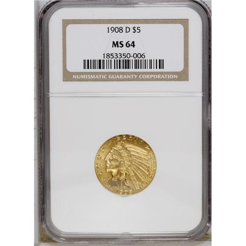 <B>1908-D $5 MS64 NGC.</B></I> The 1908-D is a much scarcer issue in the five dollar Indian series. The MS64 level is generally the finest one can locate this date and mintmark combination, and none have been certified in MS66. This is a bright reddish-golden example that shows a few small abrasions scattered over the surfaces. Sharply struck, except at the top of the eagle's wing.<BR><BR><b>Shipping:</b> Coin/Currency (<a target="_blank" href="http://www.heritageauctions.com/common/shipping.php">view shipping information</a>)