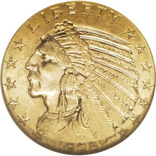 <B>1908-D $5 MS64 NGC.</B></I> This is a well struck and beautifully lustrous coin, with fine-grained, antique-gold surfaces. Despite its premium appearance, a single scrape on the Indian's chin and in the field before it holds the coin back from an even finer grade. The eye appeal is nonetheless considerable, and precious few pieces are graded higher at either service. NGC has certified only four pieces finer, with eight coins at PCGS (4/07).<BR><BR><b>Shipping:</b> Coins & Currency (<a target="_blank" href="http://www.heritageauctions.com/common/shipping.php">view shipping information</a>)