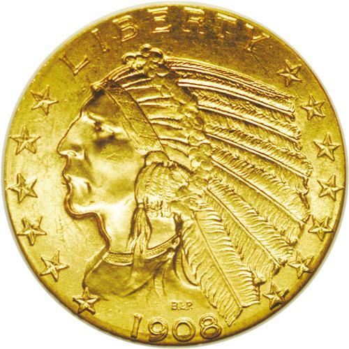 <B>1908-D<$5> MS64 NGC.</B></I> This is an important opportunity to acquire a seldom encountered Choice Mint State example of the issue, one of just 148,000 examples originally coined nearly a century ago. The surfaces are highly lustrous and attractive with brilliant yellow-gold color and frosty texture. At this grade level, it is among the finest examples reasonably attainable by most collectors. Few finer examples are known to exist. Census: 138 in 64, 4 finer (4/06).
