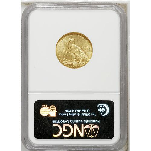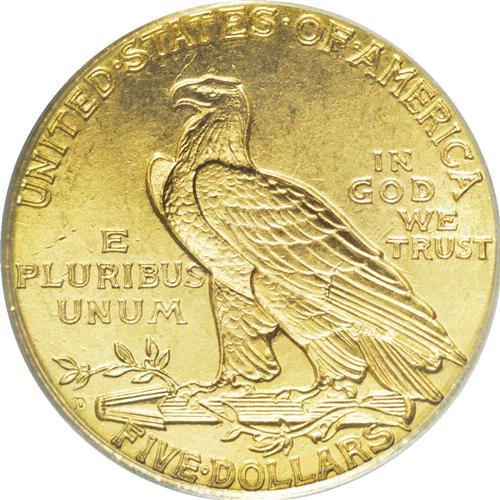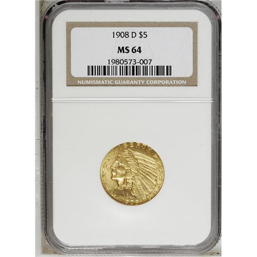 <B>1908-D $5 MS64 PCGS.</B></I> Several small hoards of 1908-D half eagles found over the years have helped maintain the supply of this issue for collectors. Perhaps the most noteworthy hoard was that from Virgil Brand, which contained a small number of MS64 pieces. We cannot say for sure that the near-Gem we offer in this lot pedigrees to Brand, nevertheless this piece radiates pleasing luster from yellow-gold surfaces, and the design elements are well impressed, save for some of the usual softness on the eagle's shoulder. A few light obverse marks limits the grade.<BR><BR><b>Shipping:</b> Coin/Currency (<a target="_blank" href="http://www.heritageauctions.com/common/shipping.php">view shipping information</a>)
