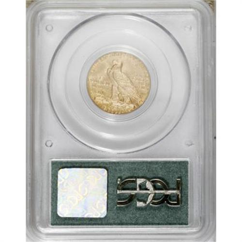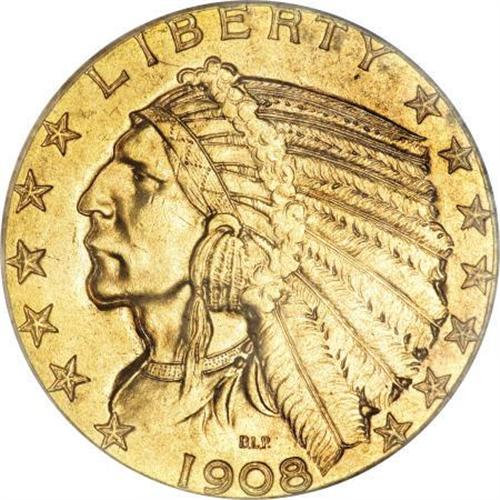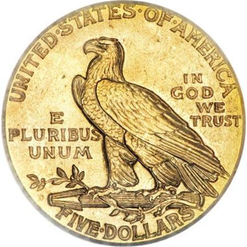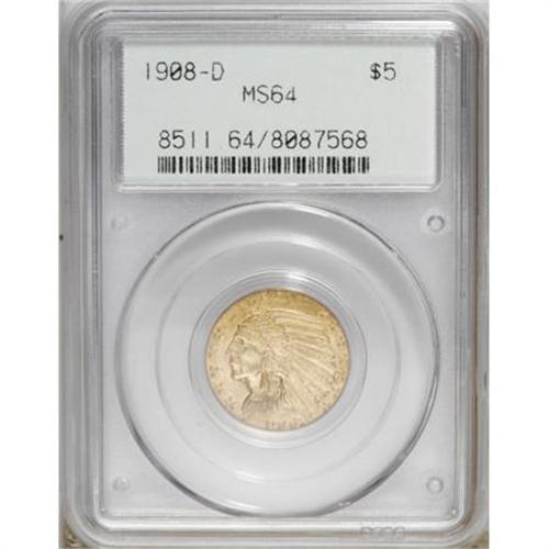 <B>1908-D $5 MS64 PCGS.</B></I> The near-Gem level of preservation is the finest grade that most collectors are likely to encounter for the 1908-D five dollar; PCGS has seen fewer than 10 pieces finer. Honey-gold color bathes both sides of this sharply struck example, and lustrous surfaces are free of significant marks or copper stains. Housed in a green-label holder.<BR><BR><B>Coin Engraver:</B> Bela Lyon Pratt<BR><BR><b>Shipping:</b> Coins & Currency (<a target="_blank" href="http://www.heritageauctions.com/common/shipping.php">view shipping information</a>)