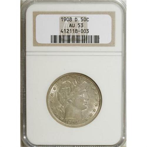 <B>1908-D 50C AU53 NGC.</B></I> NGC Census: (7/166). PCGS Population (10/238). Mintage: 3,280,000. Numismedia Wsl. Price for NGC/PCGS coin in AU53: $250. (#6513)<BR><BR><B>Coin Engraver:</B> Charles E. Barber<BR><BR><b>Shipping:</b> Coins & Currency (<a target="_blank" href="http://www.heritageauctions.com/common/shipping.php">view shipping information</a>)