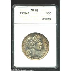 1908-D 50C AU55 ANACS. Excellent portions of mint luster remain on each side and there is scattered golden toning around the peripheries. A set of AU55 Barber Halves similar to this piece would be a very impressive collection.From the Ohio Collection. Important notice: We expect to be auctioning lots at the rate of 200-250 per hour. Sometimes eBay Premier live bid software cannot keep up with that pace, so we strongly recommend that you place a realistic proxy bid now as insurance to avoid disappointment. Also please note that all Heritage/CAA lots purchased through eBay Premier carry a 20% Buyer's Premium. Please make sure you read the Terms and Conditions.