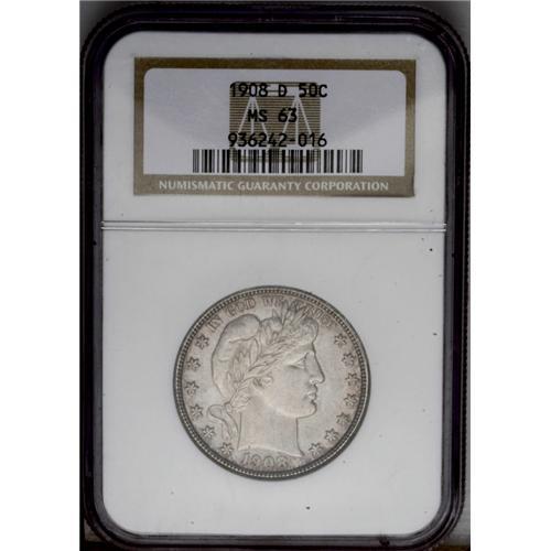 <B>1908-D<50C> MS63 NGC.</B></I> Dove-gray and tan-gold toning blankets this satiny and sharply struck example. Clean for the assigned grade, and much scarcer in Mint State than implied by the mintage. Census: 21 in 63, 53 finer (3/06). <BR><BR><B>Important notice:</B> Heritage usually auctions material at the rate of 200-250 lots per hour. On some occasions eBay Live bid software or the Internet may not be able to keep up with the pace of the auction. We recommend placing a realistic absentee bid now as insurance to avoid disappointment. Occasionally the auctioneer may eliminate or reject an eBay Live bid, and the auctioneer may also reopen a lot after the close of the eBay live bidding (usually because we missed an audience bid), and may reject your bid even if it shows you as the winning bidder. By bidding via eBay Live, you agree that Heritage may award the lot to another bidder at its sole discretion under the circumstances described above or any other reasonable circumstances. Since eBay bids are not shown to us until we open the lot on the floor, we treat those bids just like floor bids. In most cases the floor responds before the eBay bid is presented to us, due to Internet lag time, so for consistency we have made it a policy that floor bids are always considered first over tie eBay live bids. Also please note that all Heritage lots purchased through eBay Live carry a 20% Buyer's Premium. Please make sure you read the Terms and Conditions before you bid. This lot is being auctioned in conjunction with a live floor auction by Heritage Galleries & Auctioneers. All final auction and invoice information will be supplied by Heritage Galleries & Auctioneers, and all other information should be considered preliminary. Lot:2069 <BR><BR><B>Winning Notification and Billing:</B> After the FINAL session in this auction is complete, Heritage will send e-mail and snail mail invoices. This process normally takes several days. All final auction and invoice information will be supplied by Heritage Galleries & Auctioneers, and all other information should be considered preliminary. <BR><BR>This auction will be conducted on a live auction floor and over the Internet through eBay Live. If you choose to place an absentee bid, please take a moment to <font color='#0000ff'><u><a href='http://pages.ebay.com/liveauctions/help/before/laabsentee.html'>learn how eBay Live absentee bidding works</a></u></font><font color='#000000'>