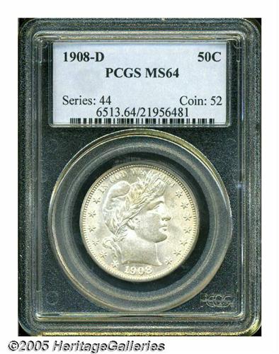 <B>1908-D<50C> MS64 PCGS.</B></I> Generally well struck and essentially untoned, with bright satiny luster and minimal surface marks for a near-Gem. Typically soft on the eagle's right (facing) talons. Population: 42 in 64, 29 finer (4/05).