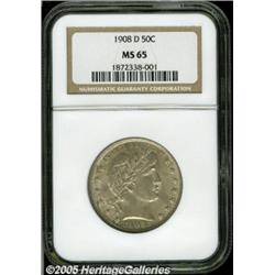 <B>1908-D 50C MS65 NGC.</B></I> An elusive Denver mint issue in higher grades. The obverse displays central luster and medium, slightly mottled gray color overall. A bit of blue is seen in the protected areas of the reverse at certain angles. The coin exhibits a solid strike and the surfaces are free of detracting blemishes. The population statistics verify the scarcity of this coin. PCGS has certified 21 pieces at this grade with only 9 coins reaching a higher grade. NGC has graded 14 coins at MS65 with a mere 7 examples receiving a higher grade (2/05). A desirable and rarely encountered Gem.
