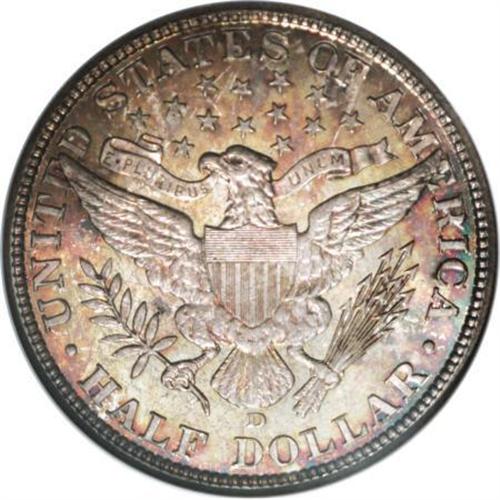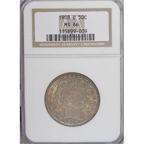 <B>1908-D 50C MS66 NGC.</B></I> Lavish cherry-red, gold, and apple-green toning dominates this exactingly struck and undisturbed Premium Gem. A tiny spot is noted above a leaftip, and an inconspicuous graze resides near obverse star 10. A prize for the connoisseur of patinated coinage. Census: 5 in 66, 2 finer (6/07).<BR><I>From The Belle Glade Collection, Part Two.</B></I><BR><BR><B>Coin Engraver:</B> Charles E. Barber<BR><BR><b>Shipping:</b> Coins & Currency (<a target="_blank" href="http://www.heritageauctions.com/common/shipping.php">view shipping information</a>\)