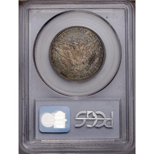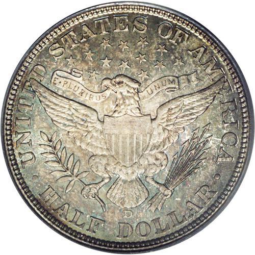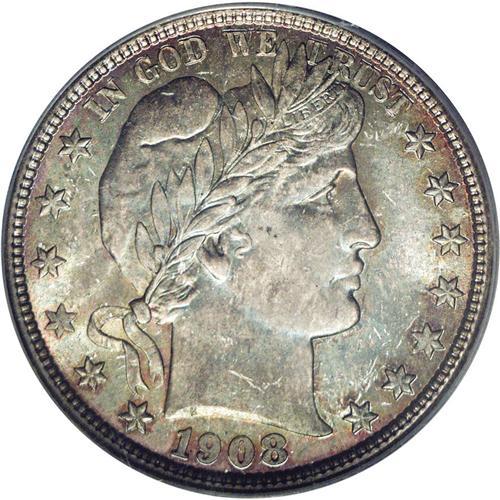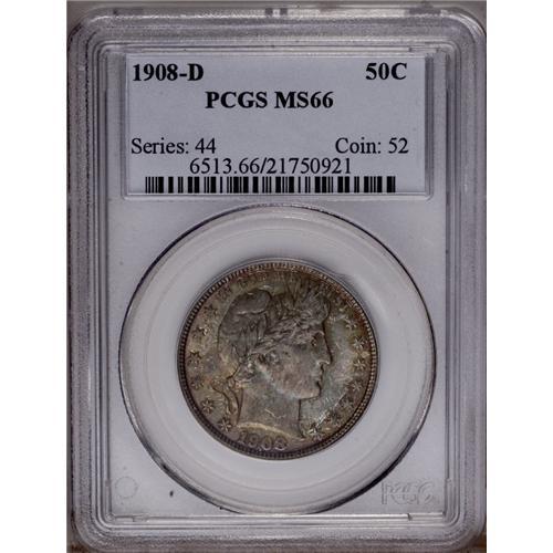 <B>1908-D<50C> MS66 PCGS.</B></I> Extremely well struck, except for minor softness in the upper right (facing) corner of the shield and adjacent wings. The vibrant, nearly blemish-free surfaces are overlaid with variegated multicolored toning that is truly one of a kind, including shades of forest-green, cobalt-blue, and reddish-gold. Several marks are detected on Liberty's cheek under close examination. A third-year Denver Mint half dollar that is not all that uncommon in Mint State, but rarely appears in such an attractive condition. Population: 5 in 66, 4 finer (2/06).