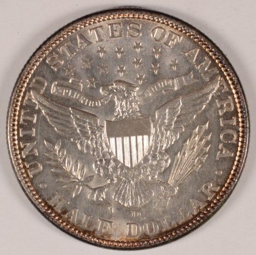 1908-D BARBER HALF DOLLAR, MS-65 GEM, PRETTY GOLD COLOR ON RIMS, WHITE CENTERS!