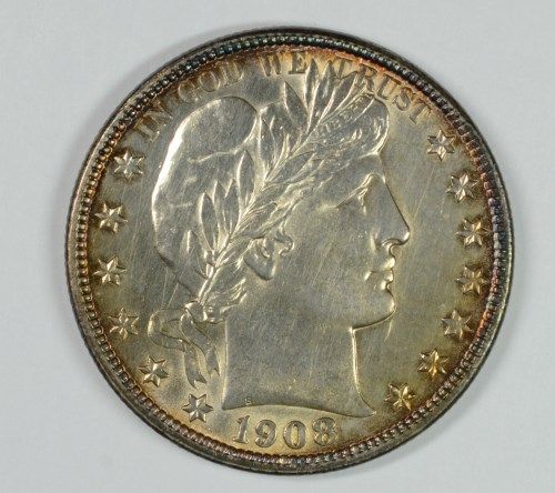 1908-D BARBER HALF DOLLAR, MS-65 GEM, PRETTY GOLD COLOR ON RIMS, WHITE CENTERS!