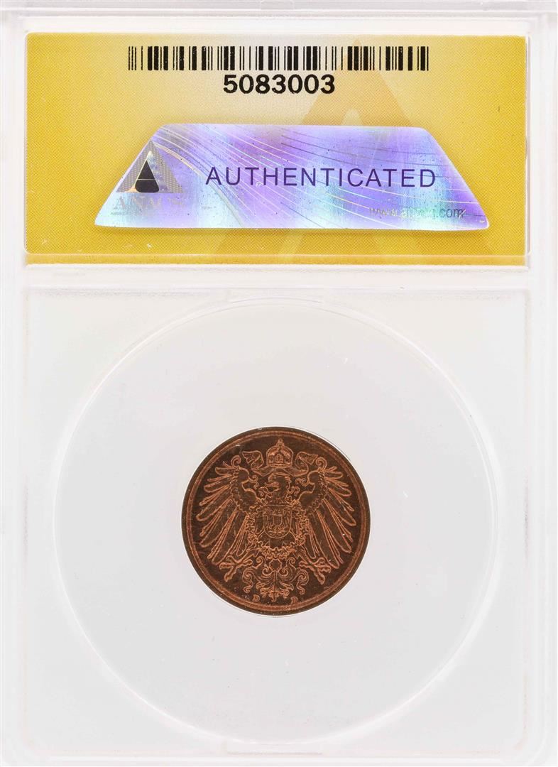 One 1908-D Germany 2 Pfennig Coin ANACS MS64Rb. ANACS Certified.