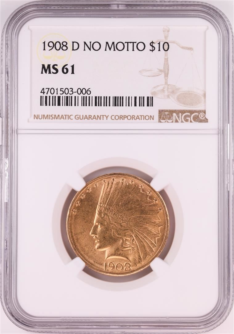 One 1908-D NO MOTTO $10 Indian Head Eagle Gold Coin NGC MS61.