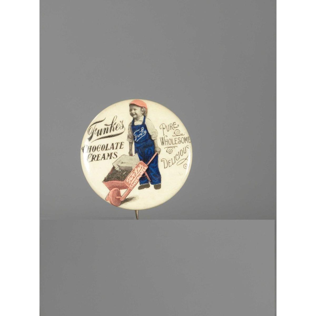 1908 Funkes Chocolate Creams Celluloid Pin Back. Some cracks in the celluloid otherwise good condition. 1 1/4 inch diameter.