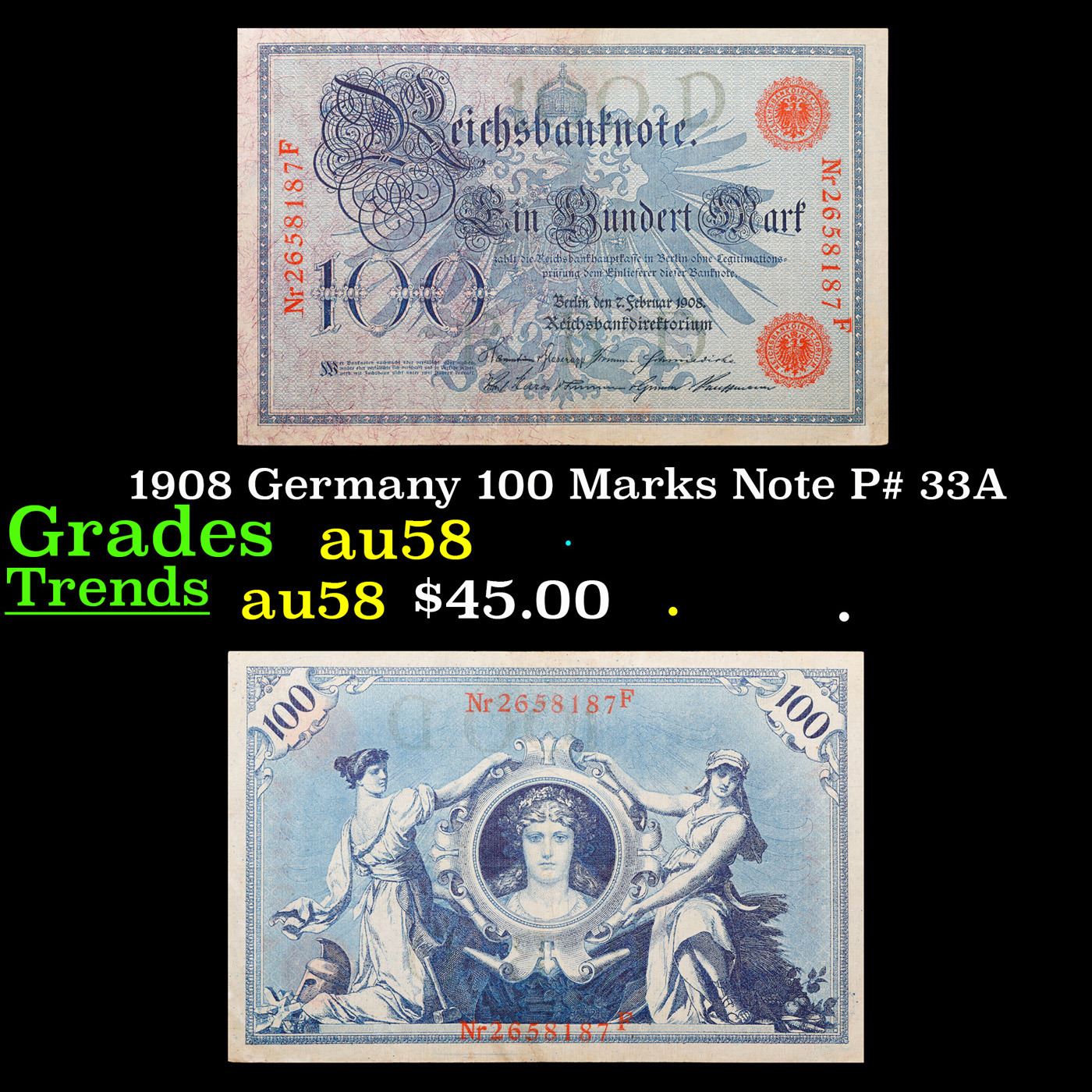 1908 Germany 100 Marks Note P# 33A Grades Choice AU/BU Slider.