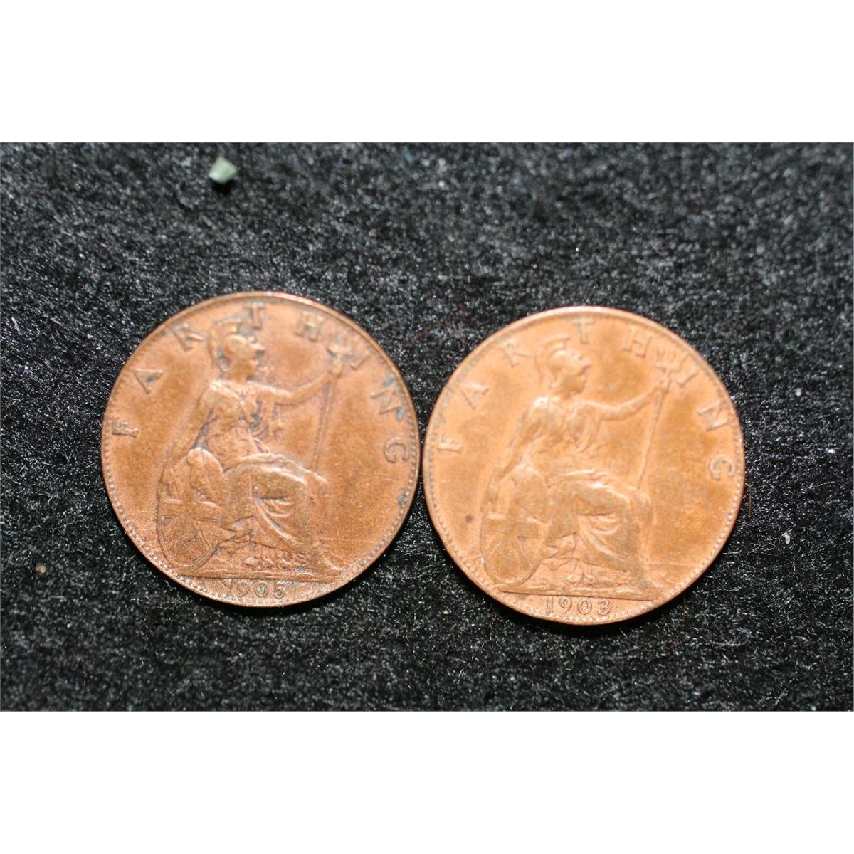 1908 Great Britain Farthing, Bronze, XF, lot of 2