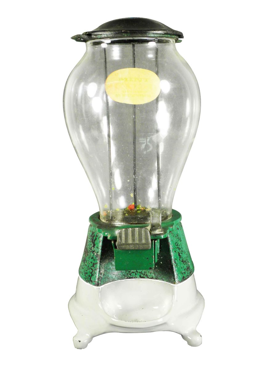 1908 Hance Standard Rex Gum - Mint Vendor. Coin-operated, one cent. Porcelain base with cast iron mechanism. Some paint loss otherwise good original condition, comes with keys. 18 1/2 inches tall.