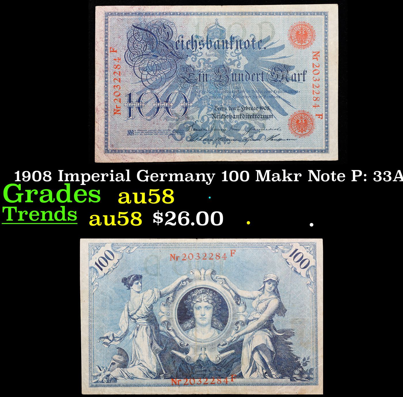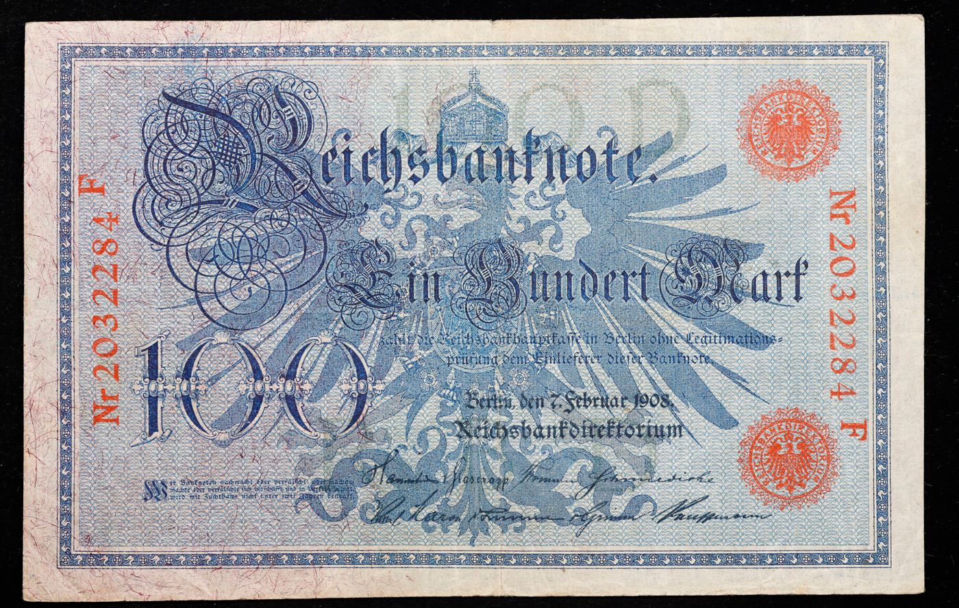 1908 Imperial Germany 100 Makr Note P: 33A Grades Choice AU/BU Slider.