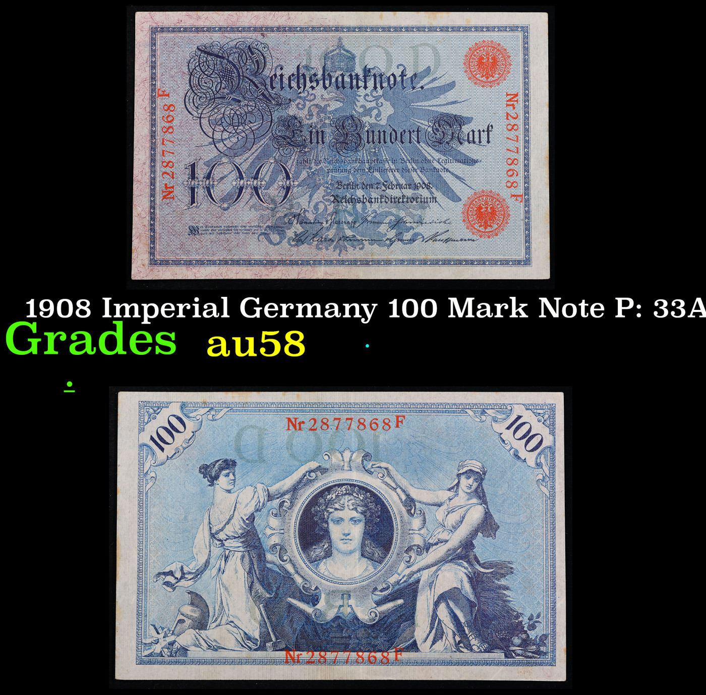 1908 Imperial Germany 100 Mark Note P: 33A Grades Choice AU/BU Slider.