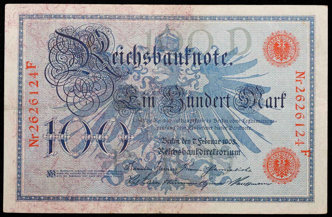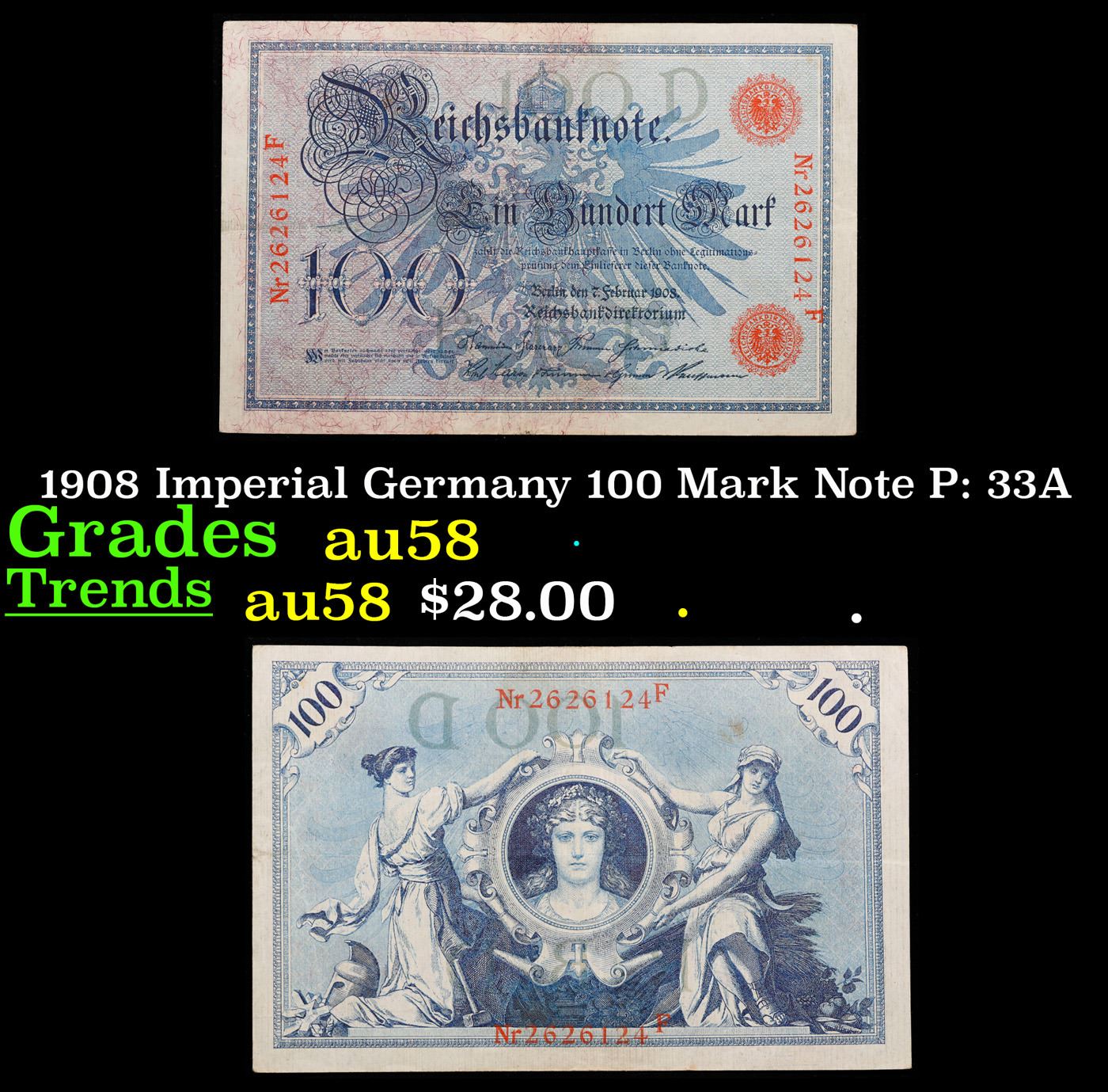 1908 Imperial Germany 100 Mark Note P: 33A Grades Choice AU/BU Slider.