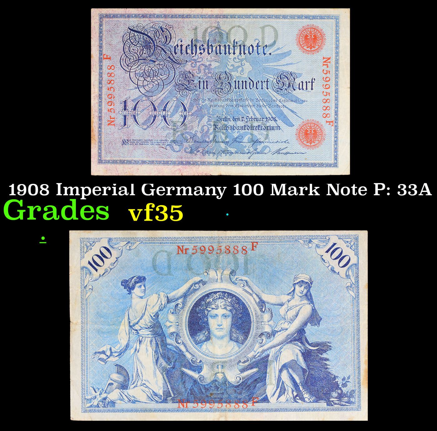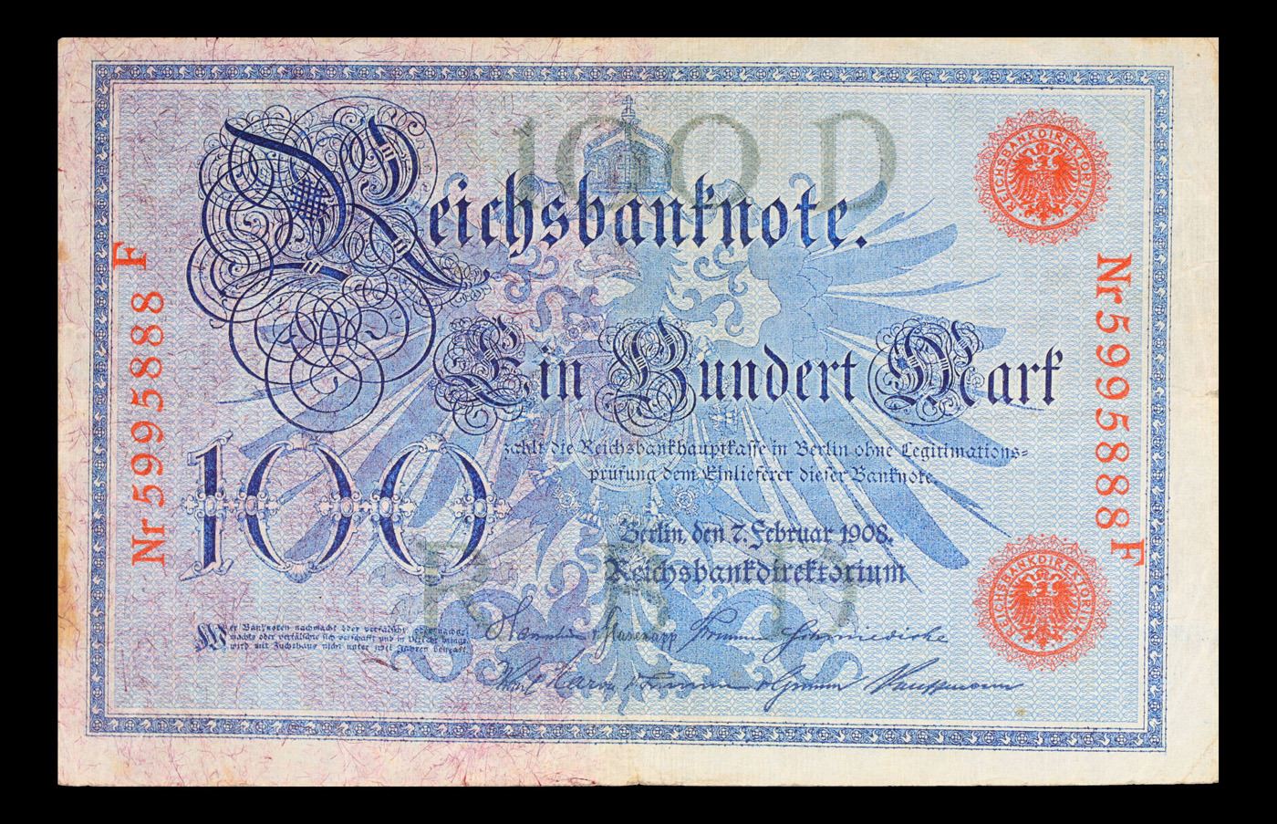1908 Imperial Germany 100 Mark Note P: 33A Grades vf++. From 1871 to 1914 the German Mark was known as the "Goldmark", as it was on the gold standard. During WWI, like most nations, Germany removed the gold backing and ceased circulation of gold coins. The Goldmark was the culmination of years of effort put into unifying the currency of Germany.