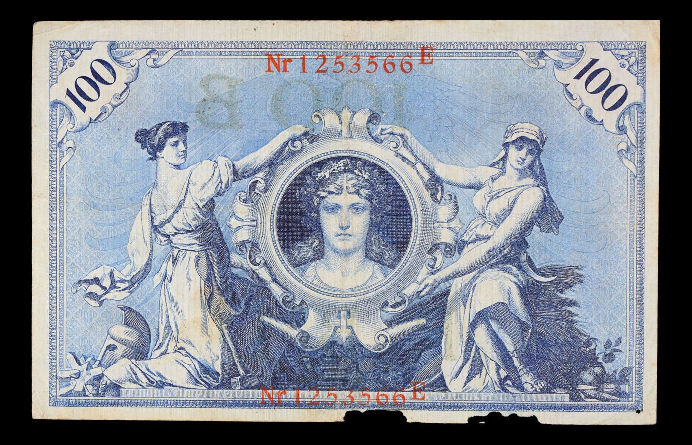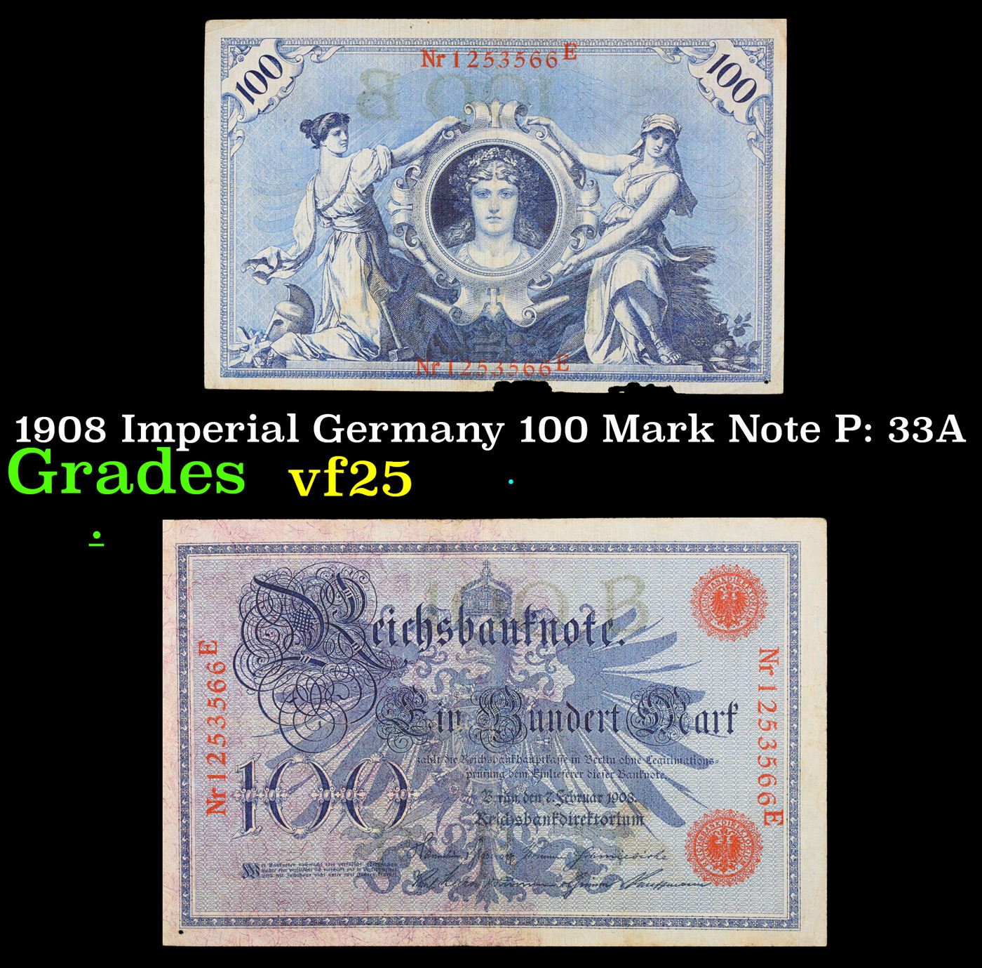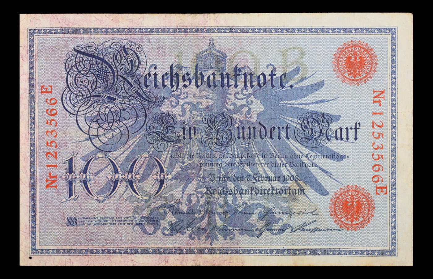 1908 Imperial Germany 100 Mark Note P: 33A Grades vf+. From 1871 to 1914 the German Mark was known as the "Goldmark", as it was on the gold standard. During WWI, like most nations, Germany removed the gold backing and ceased circulation of gold coins. The Goldmark was the culmination of years of effort put into unifying the currency of Germany.