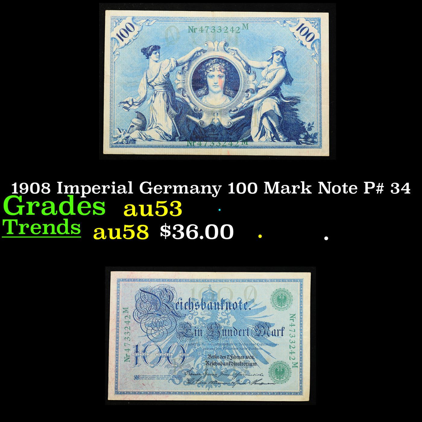 1908 Imperial Germany 100 Mark Note P# 34 Grades Select AU.