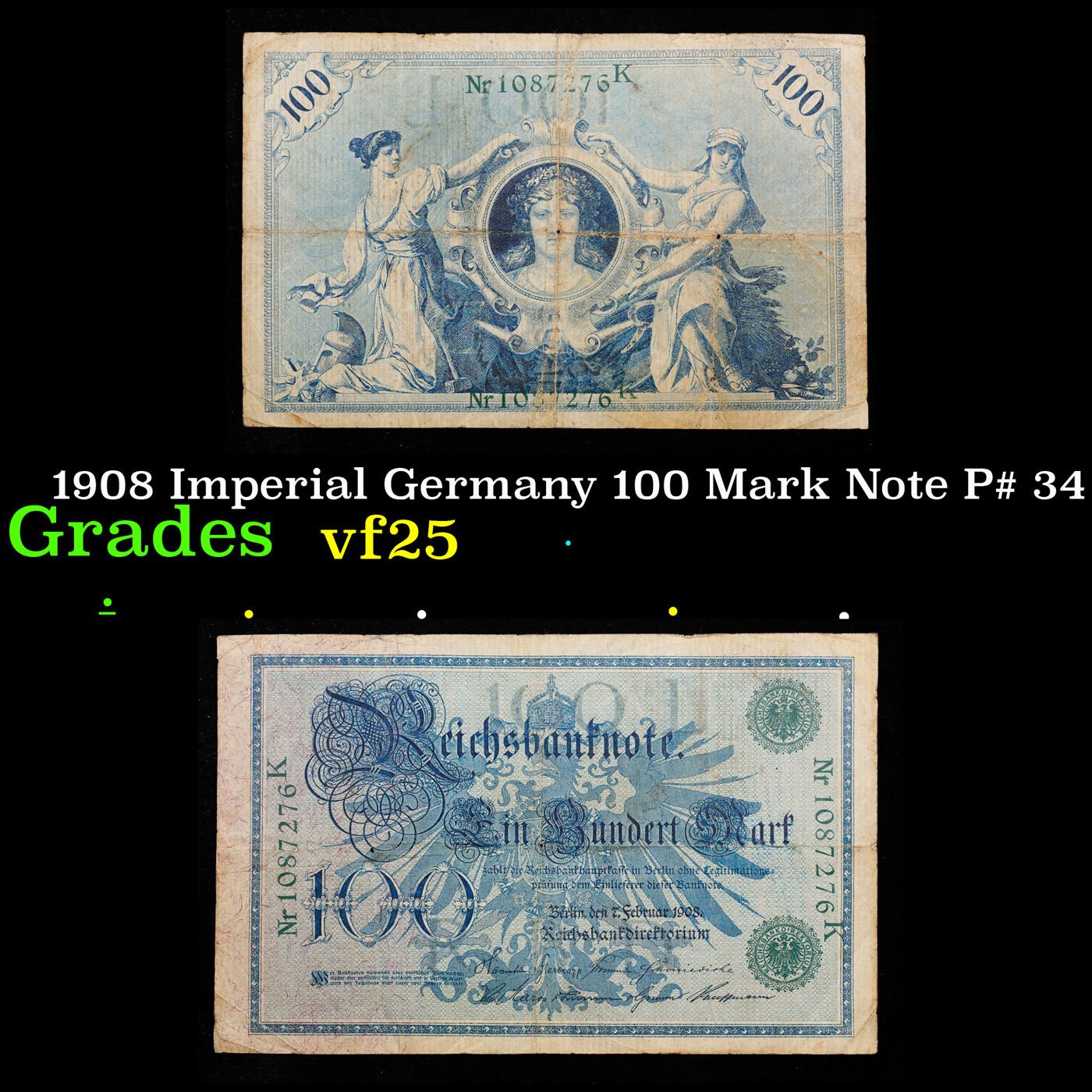 1908 Imperial Germany 100 Mark Note P# 34 Grades vf+.