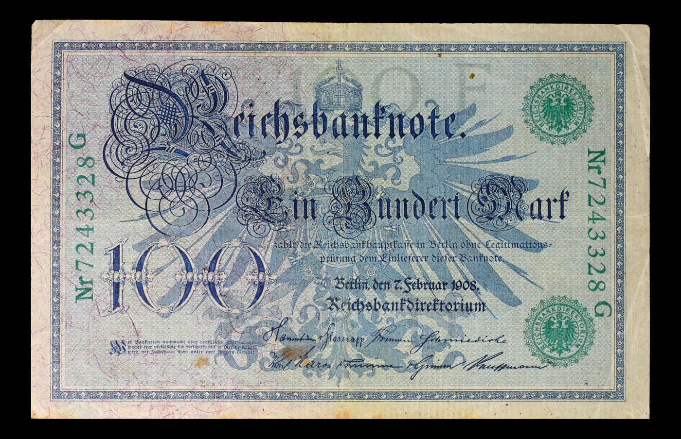 1908 Imperial Germany 100 Mark Note P# 34 Grades vf++. From 1871 to 1914 the German Mark was known as the "Goldmark", as it was on the gold standard. During WWI, like most nations, Germany removed the gold backing and ceased circulation of gold coins. The Goldmark was the culmination of years of effort put into unifying the currency of Germany.