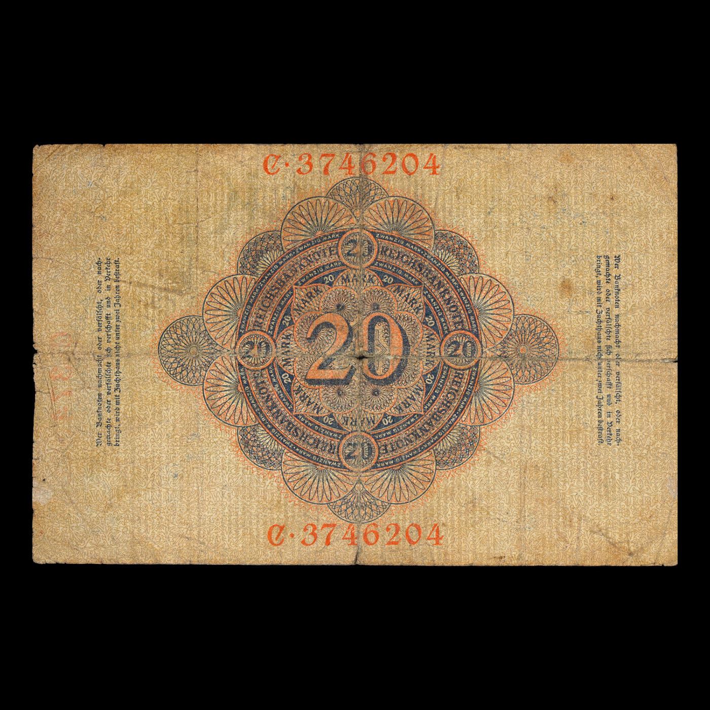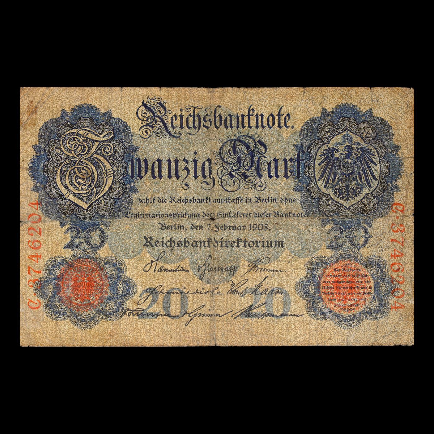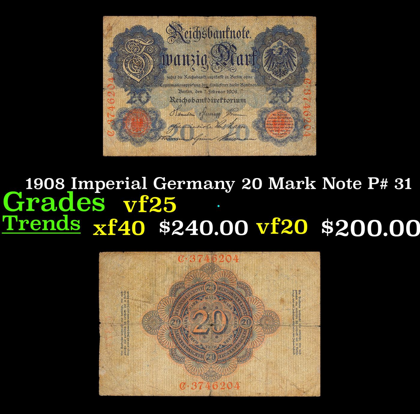 1908 Imperial Germany 20 Mark Note P# 31 Grades vf+.
