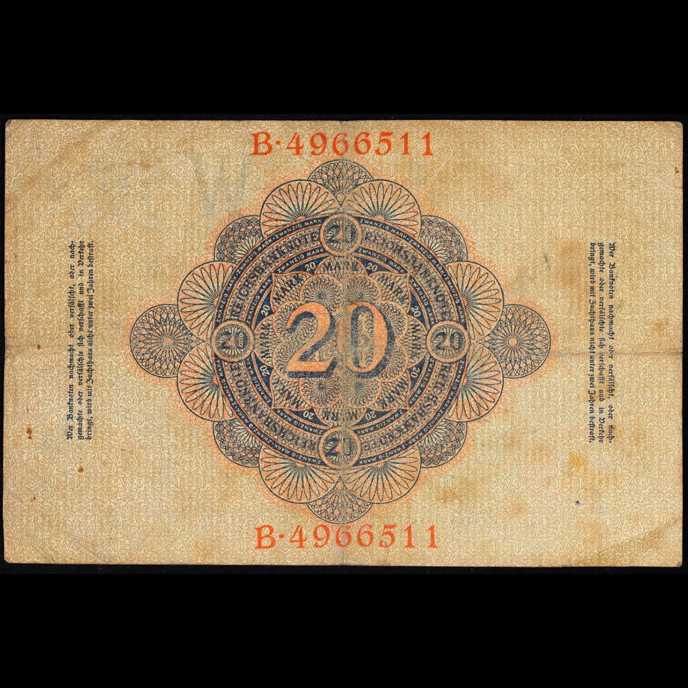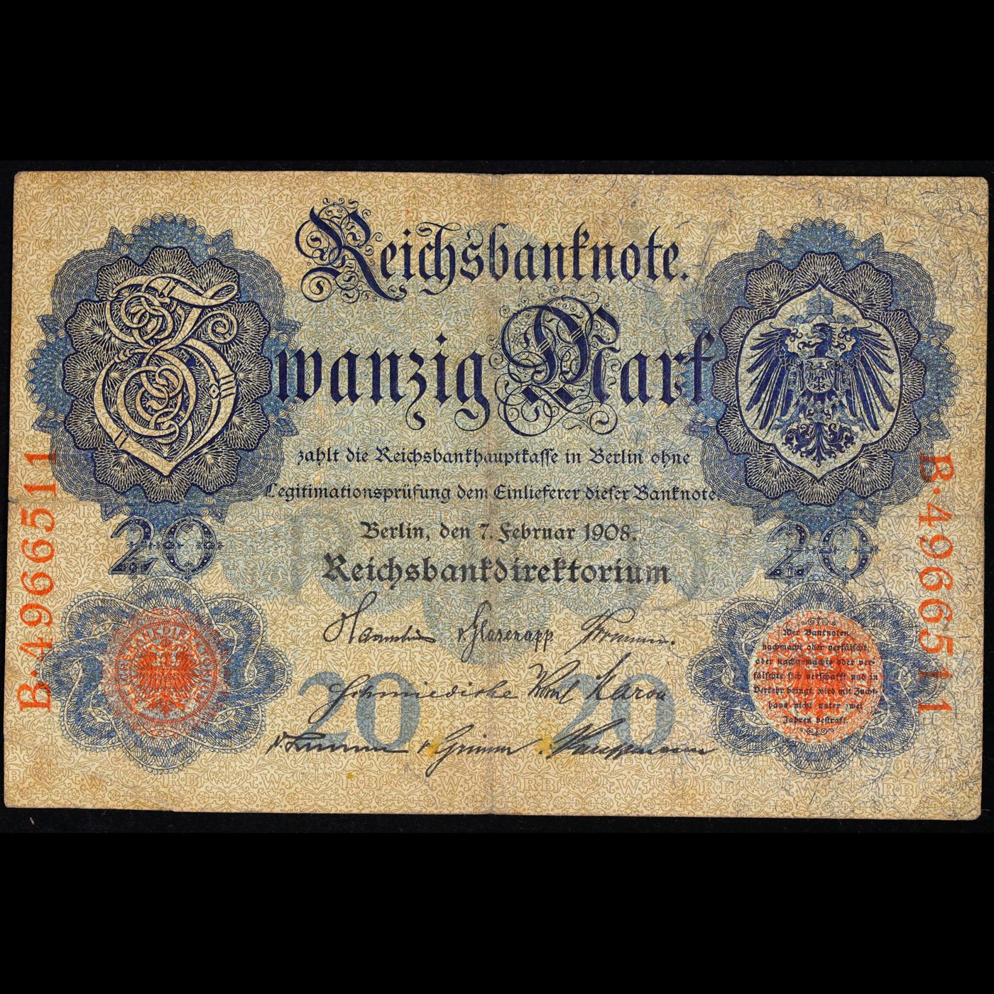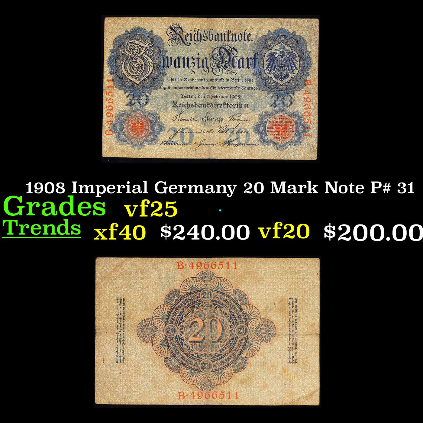 1908 Imperial Germany 20 Mark Note P# 31 Grades vf+.