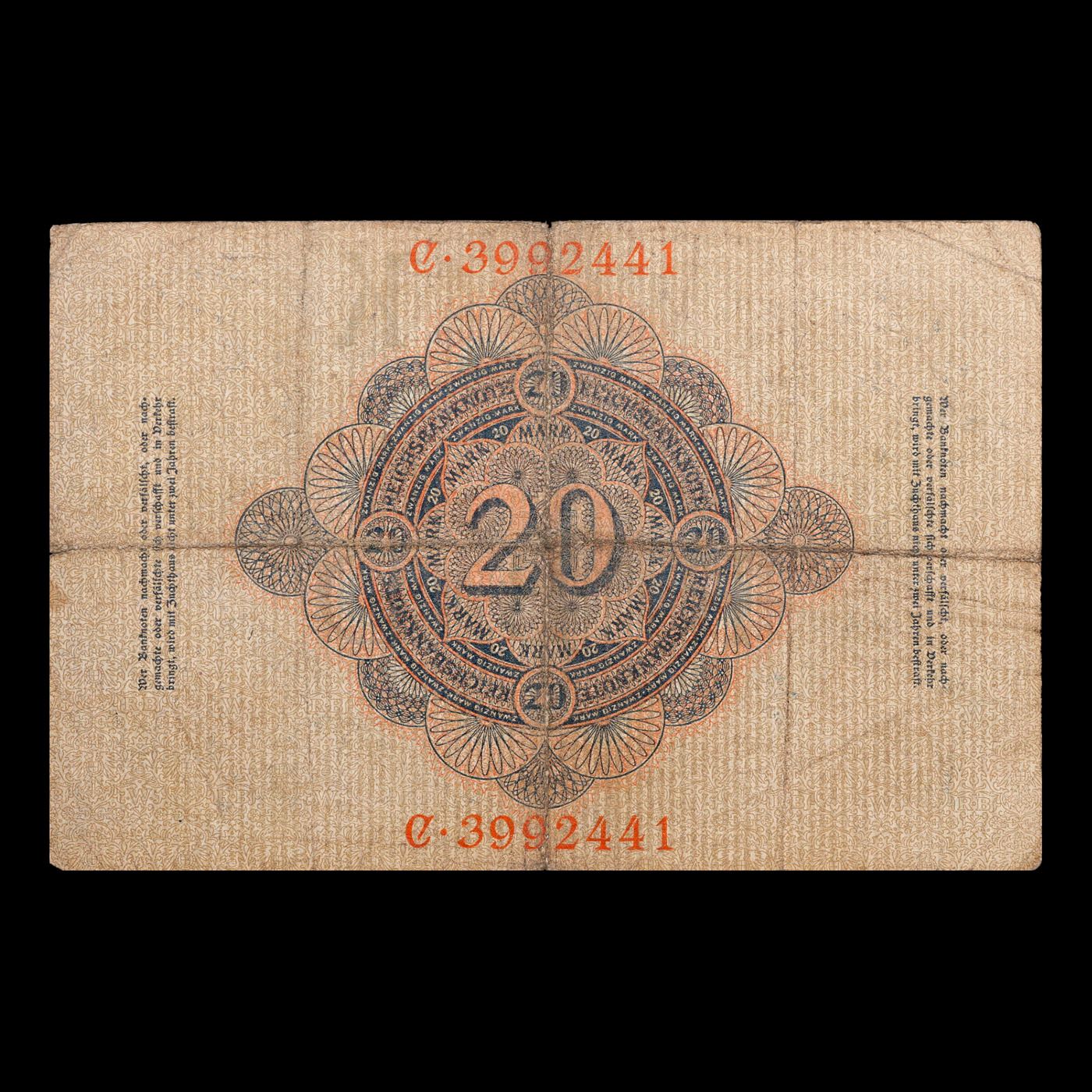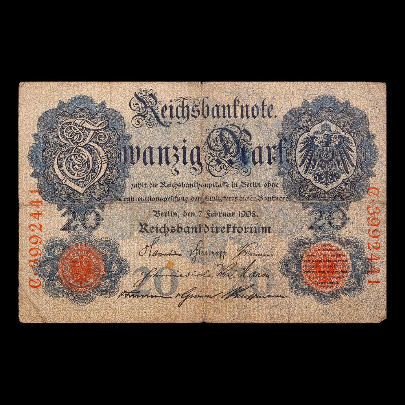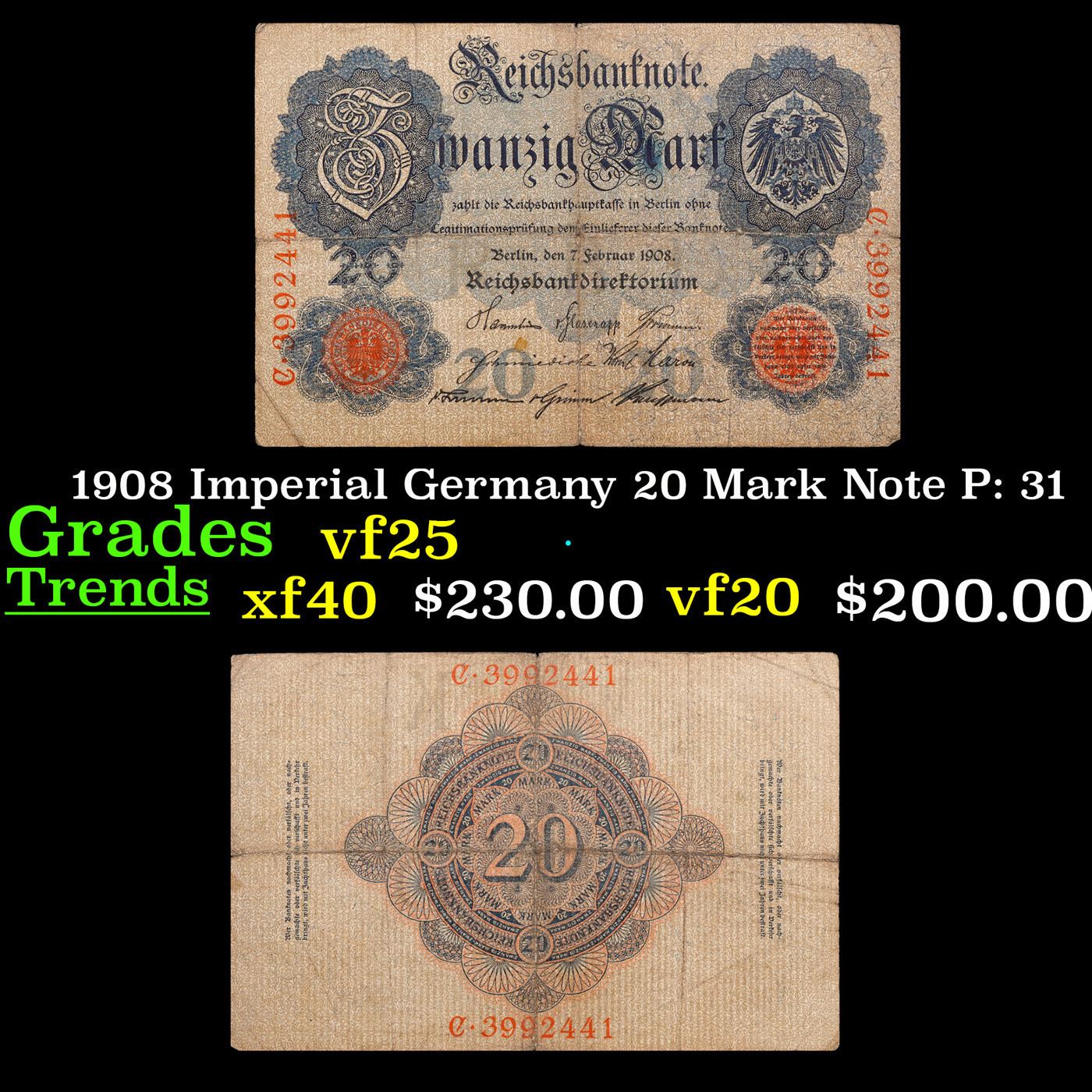 1908 Imperial Germany 20 Mark Note P: 31 Grades vf+. From 1871 to 1914 the German Mark was known as the "Goldmark", as it was on the gold standard. During WWI, like most nations, Germany removed the gold backing and ceased circulation of gold coins. The Goldmark was the culmination of years of effort put into unifying the currency of Germany.