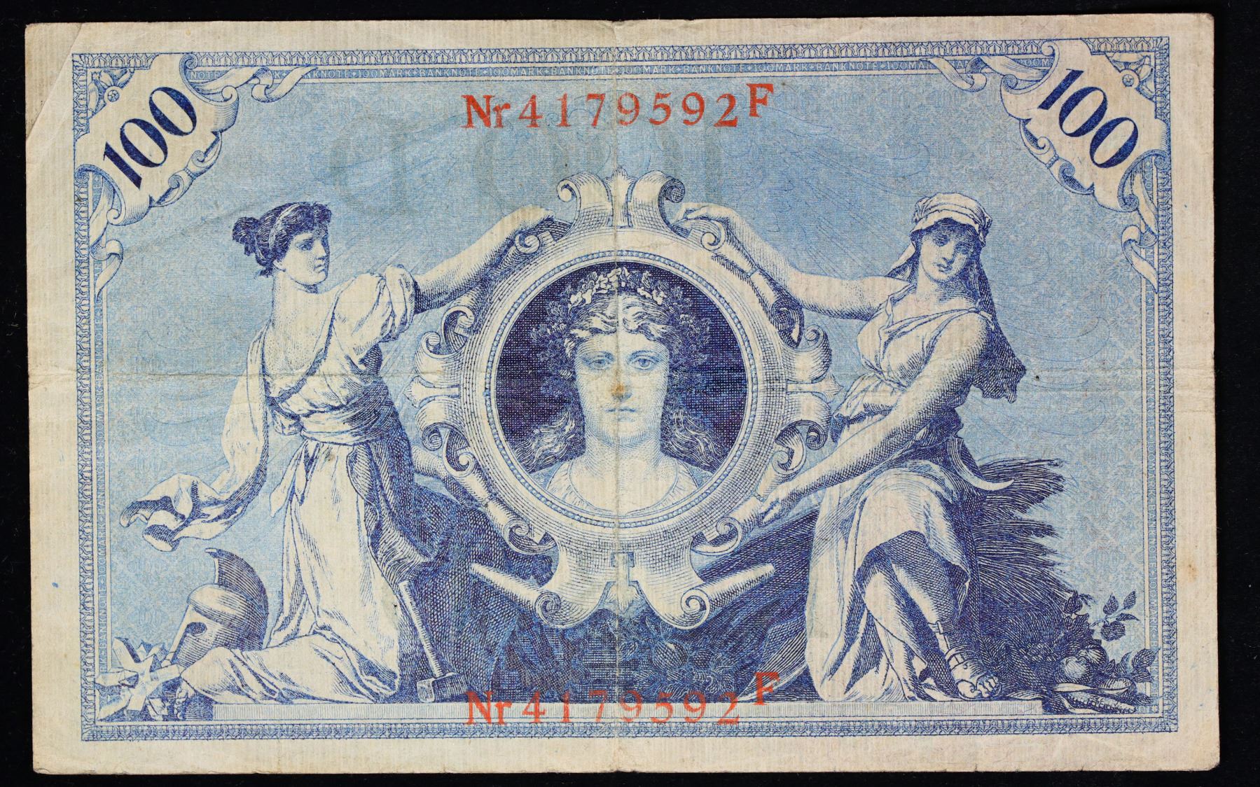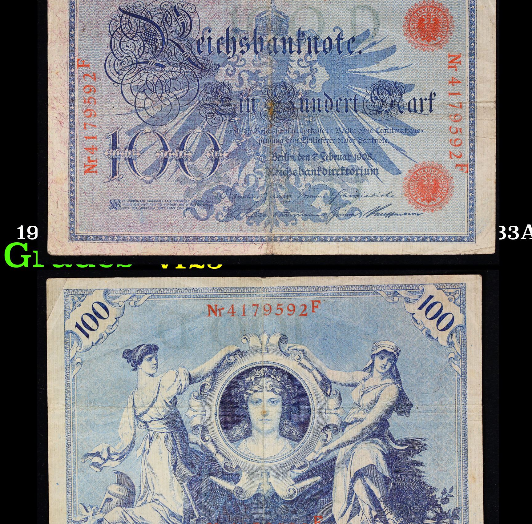 1908 Imperial Gremany 100 Mark Note P# 33A Grades vf+. From 1871 to 1914 the German Mark was known as the "Goldmark", as it was on the gold standard. During WWI, like most nations, Germany removed the gold backing and ceased circulation of gold coins. The Goldmark was the culmination of years of effort put into unifying the currency of Germany.