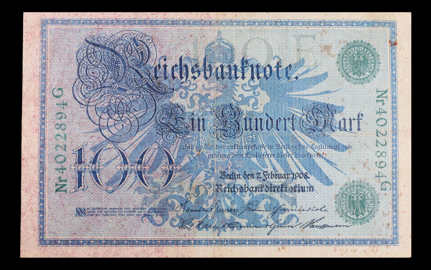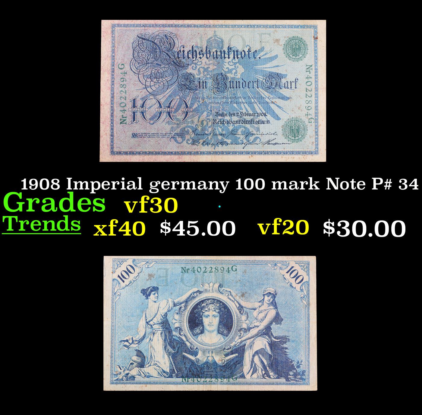 1908 Imperial germany 100 mark Note P# 34 Grades vf++. From 1871 to 1914 the German Mark was known as the "Goldmark", as it was on the gold standard. During WWI, like most nations, Germany removed the gold backing and ceased circulation of gold coins. The Goldmark was the culmination of years of effort put into unifying the currency of Germany.