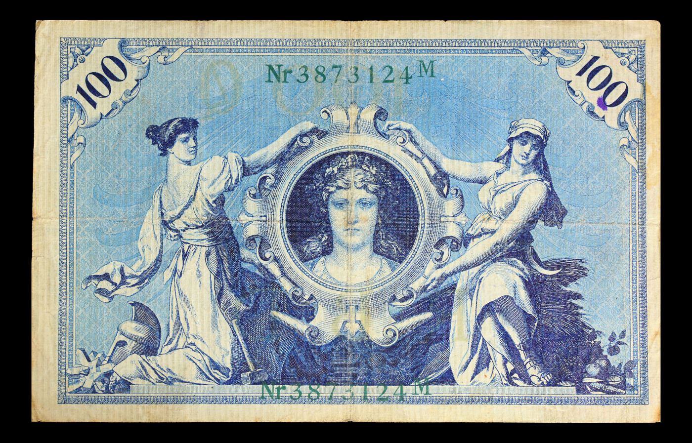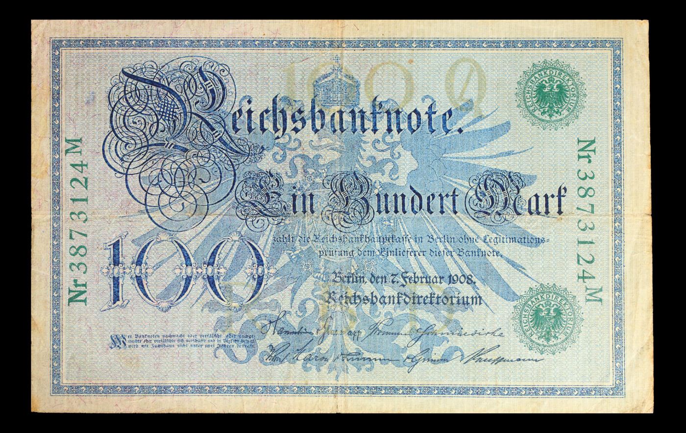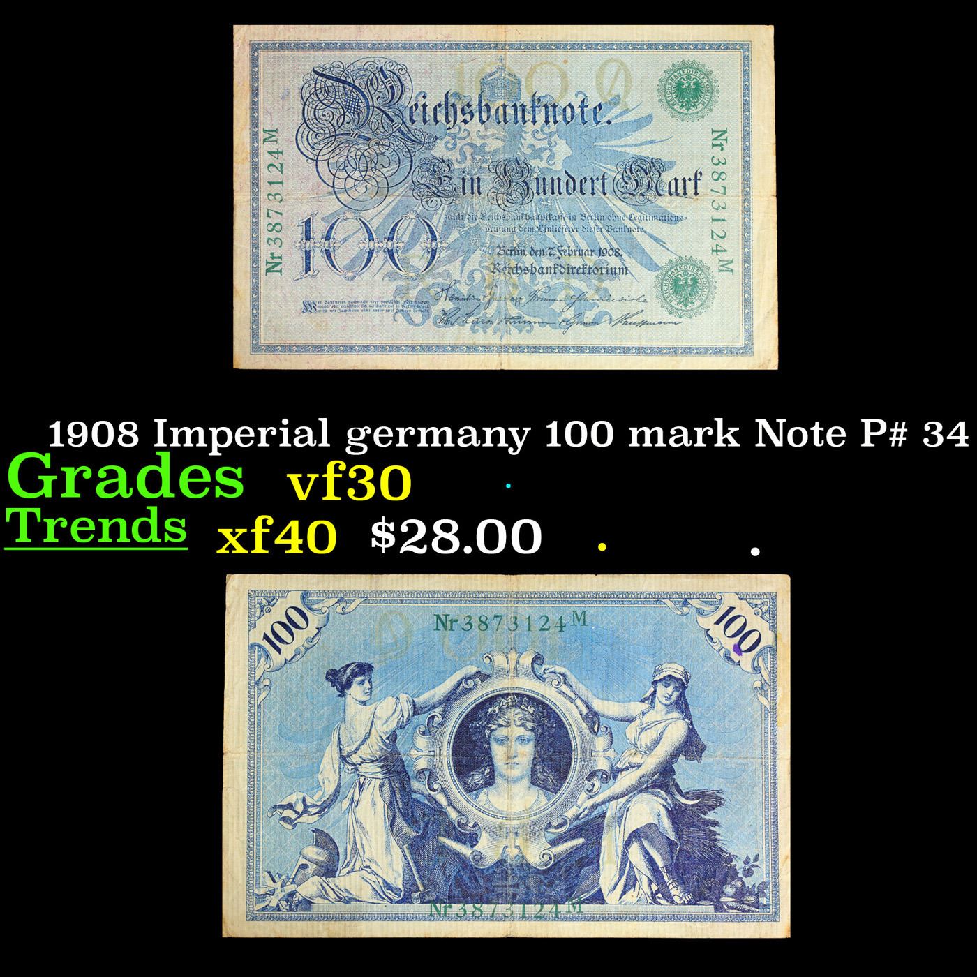 1908 Imperial germany 100 mark Note P# 34 Grades vf++. From 1871 to 1914 the German Mark was known as the "Goldmark", as it was on the gold standard. During WWI, like most nations, Germany removed the gold backing and ceased circulation of gold coins. The Goldmark was the culmination of years of effort put into unifying the currency of Germany.