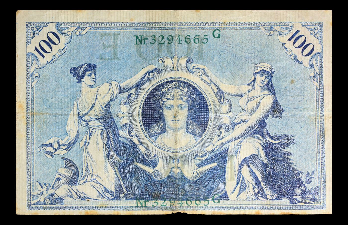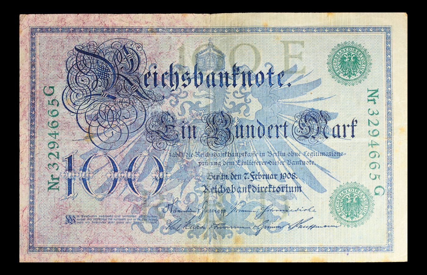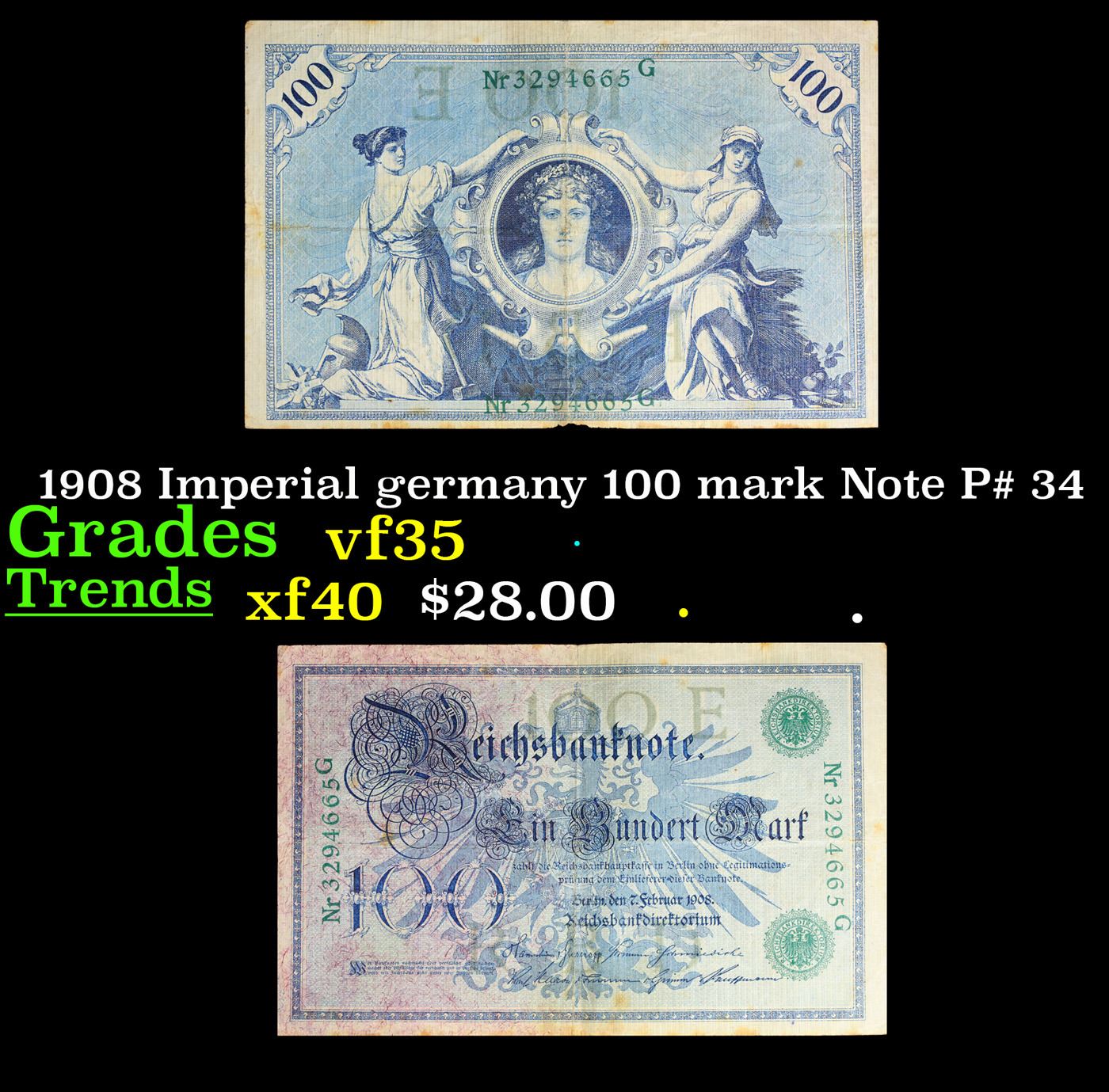 1908 Imperial germany 100 mark Note P# 34 Grades vf++. From 1871 to 1914 the German Mark was known as the "Goldmark", as it was on the gold standard. During WWI, like most nations, Germany removed the gold backing and ceased circulation of gold coins. The Goldmark was the culmination of years of effort put into unifying the currency of Germany.