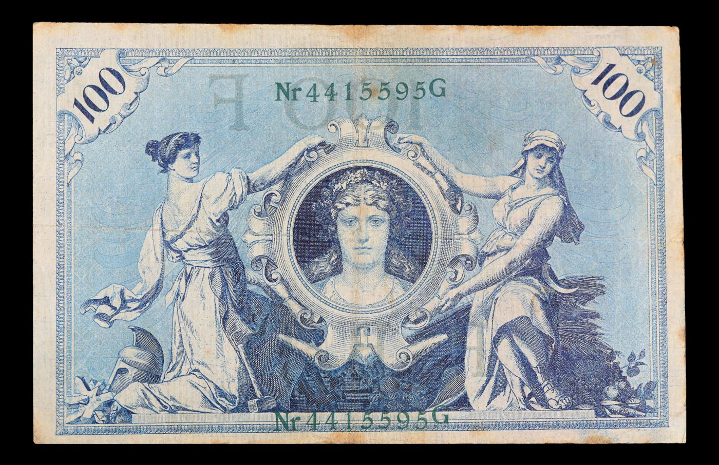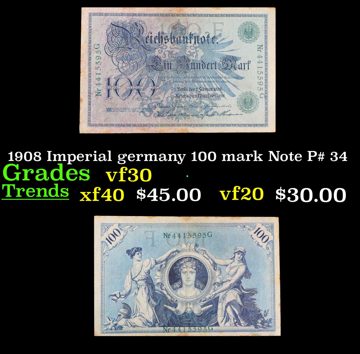 1908 Imperial germany 100 mark Note P# 34 Grades vf++. From 1871 to 1914 the German Mark was known as the "Goldmark", as it was on the gold standard. During WWI, like most nations, Germany removed the gold backing and ceased circulation of gold coins. The Goldmark was the culmination of years of effort put into unifying the currency of Germany.