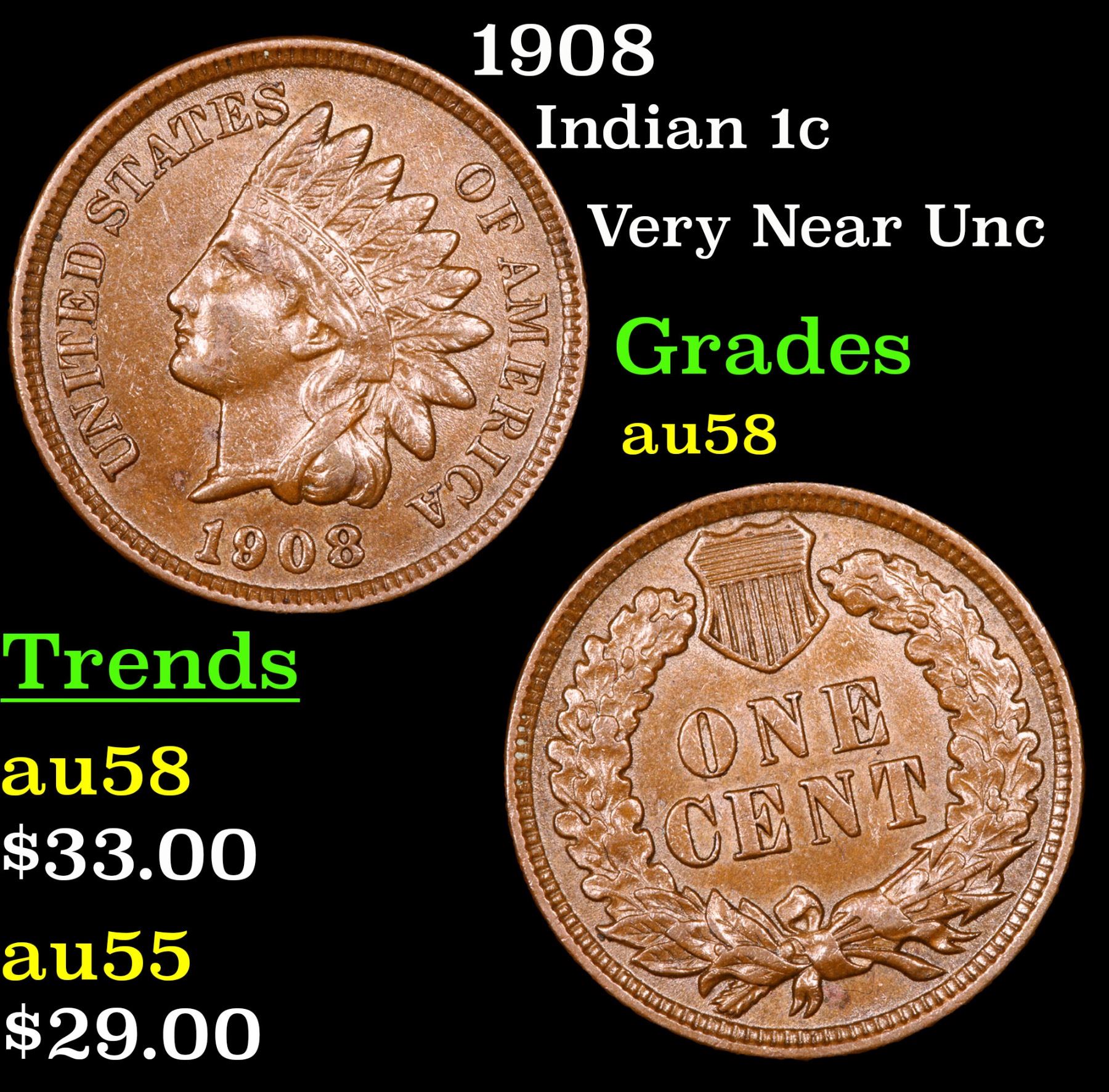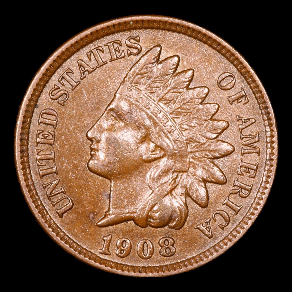 1908 . Very Near Unc Indian Cent 1c Grades Choice AU/BU Slider.
