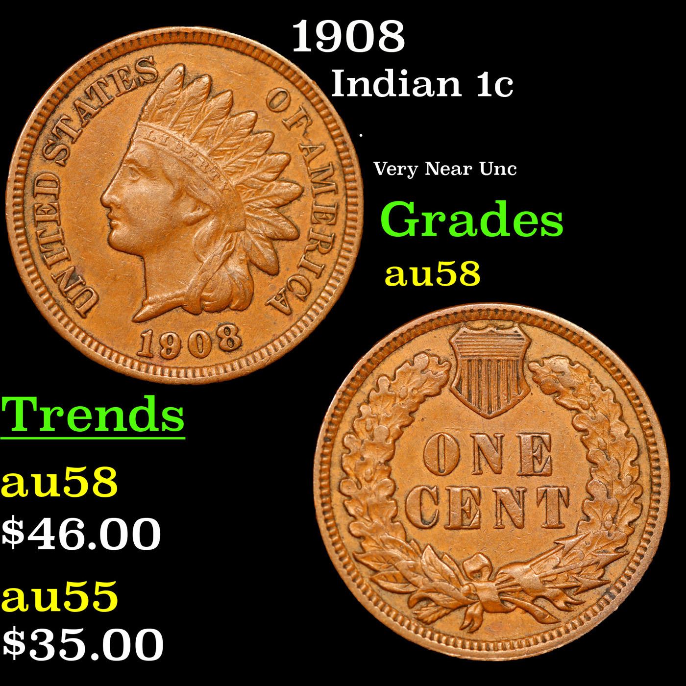 1908 Indian Cent 1c Grades Choice AU/BU Slider.