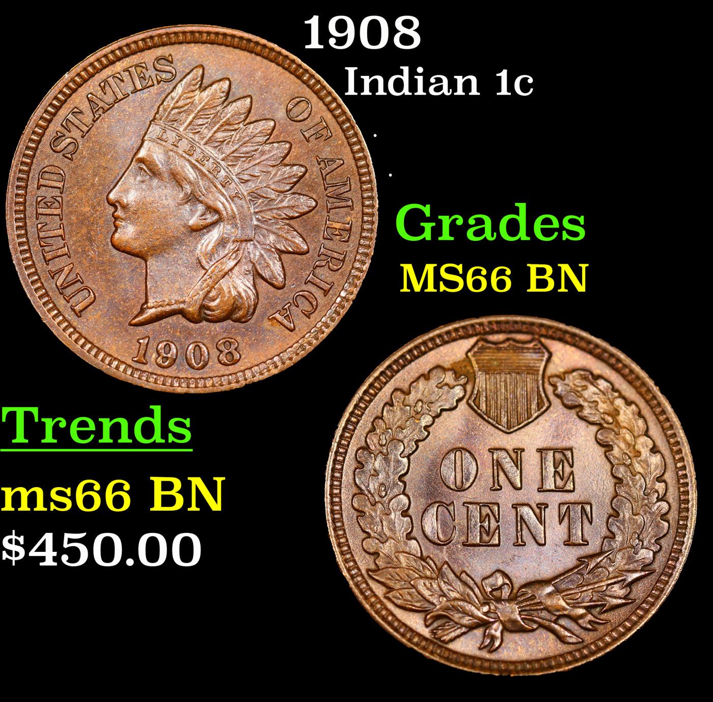 1908 Indian Cent 1c Grades GEM+ Unc BN