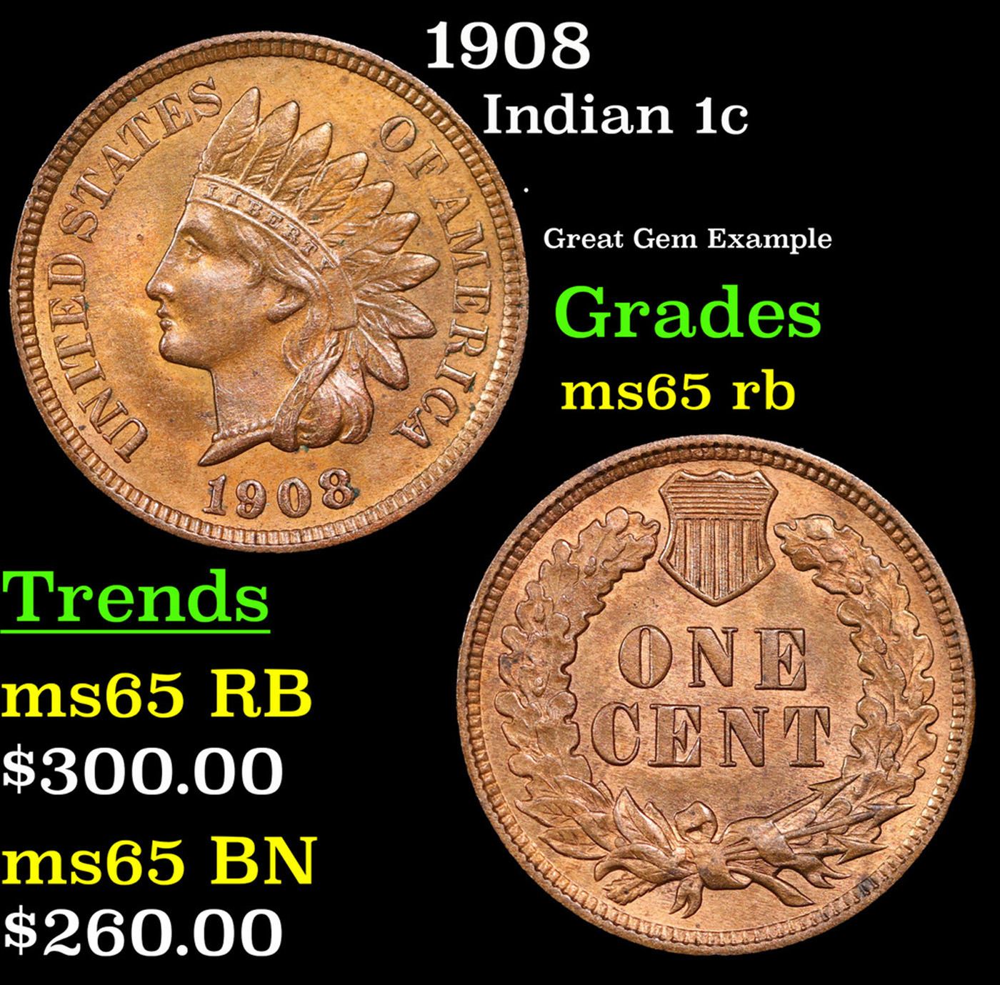 1908 Indian Cent 1c Grades GEM Unc RB.