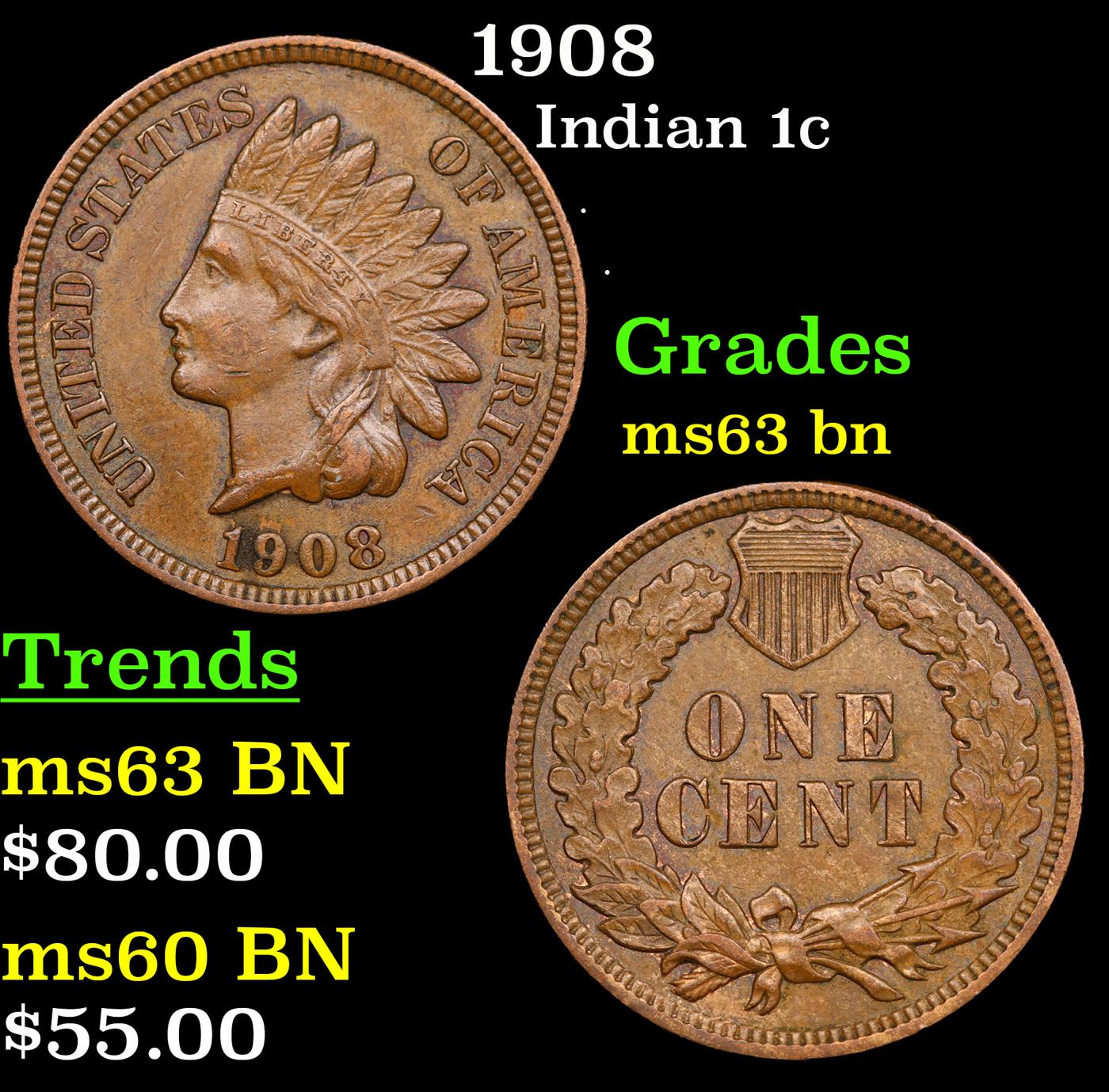 1908 Indian Cent 1c Grades Select Unc BN.