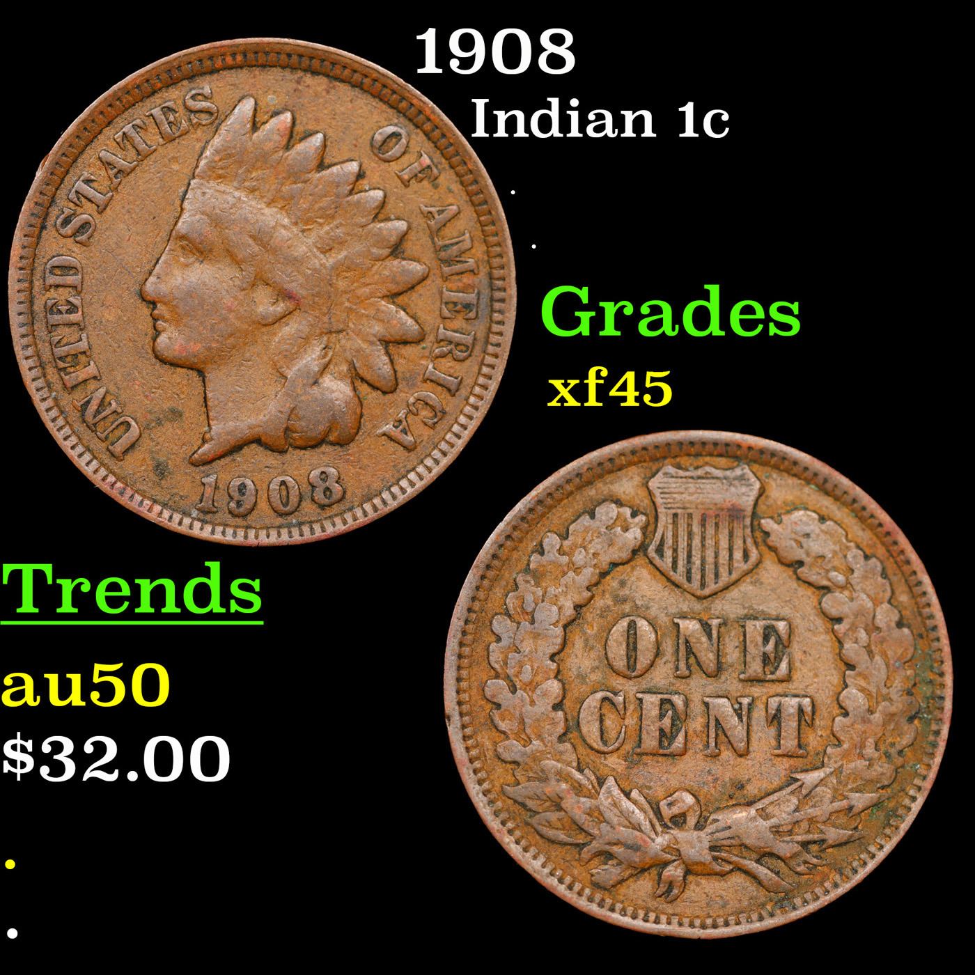 1908 Indian Cent 1c Grades xf+.