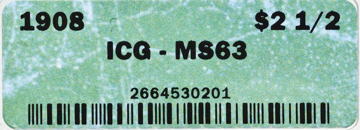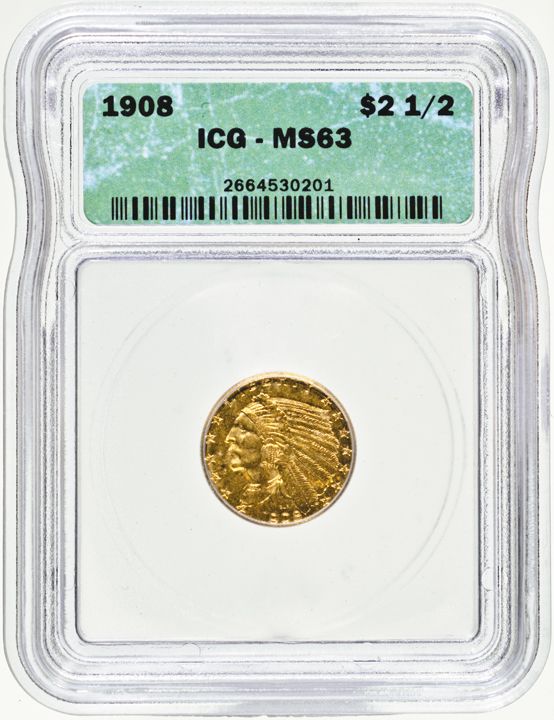 1908 Indian Head $2.50 Gold Quarter Eagle, ICG graded Mint State-63