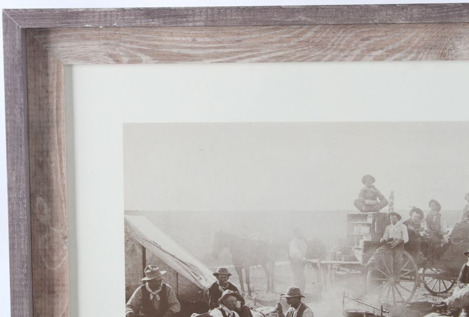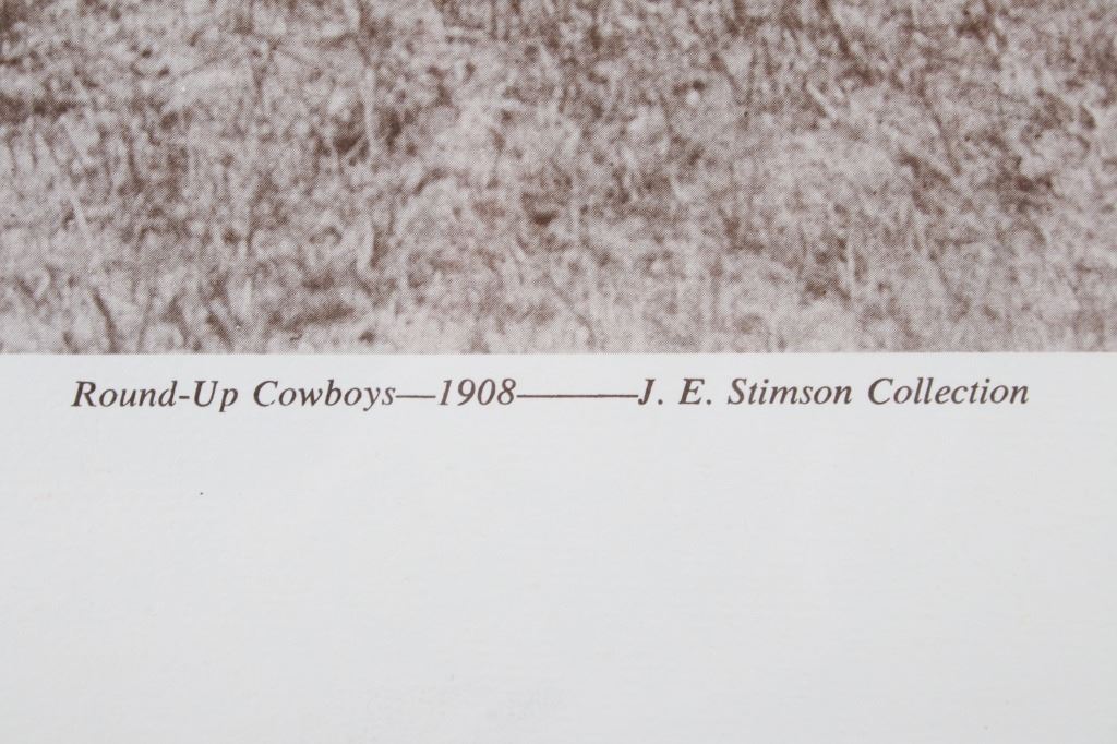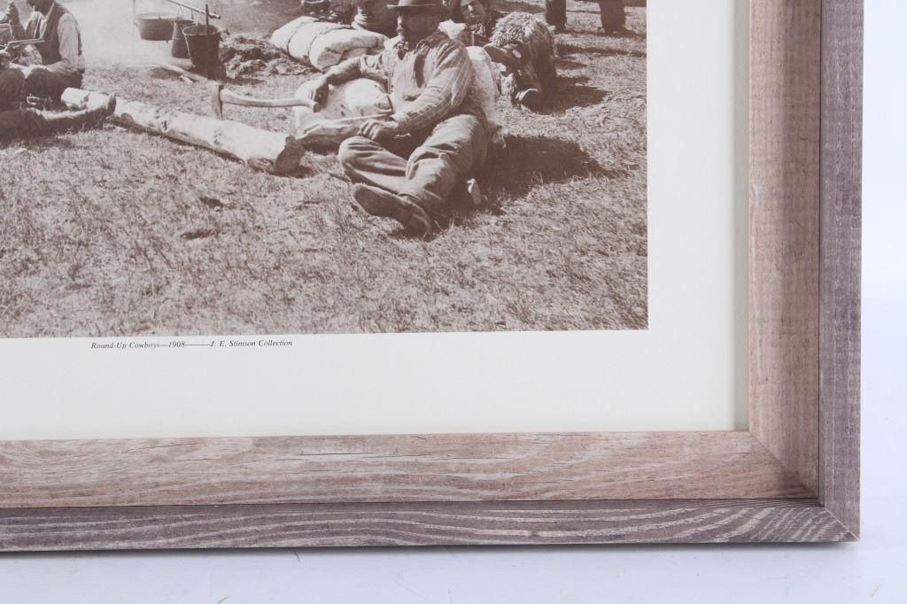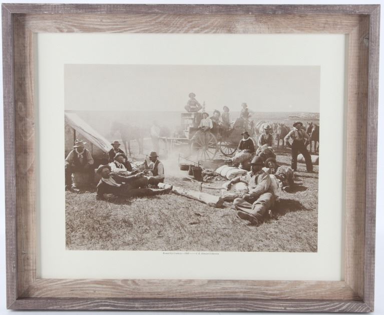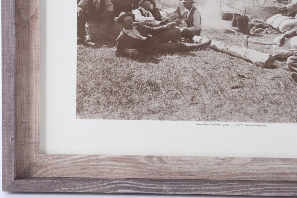 Featured in this lot is this photographic print of "Round-up Cowboys" from the personal collection of J.E. Stimson. The photograph features a wholesome scene of working cowboys taking lunch during a round-up, where they are posing on the chuck wagon beside the fire; one gentleman is showcasing his sidearm and the horses are picketed in the background. The condition of this photograph is good, with no obvious signs of damage to the photo or the frame. The measurements of framed photograph are 19 1/4" x 23 1/4" and the visible art measures 15 1/2" x 19 1/2".