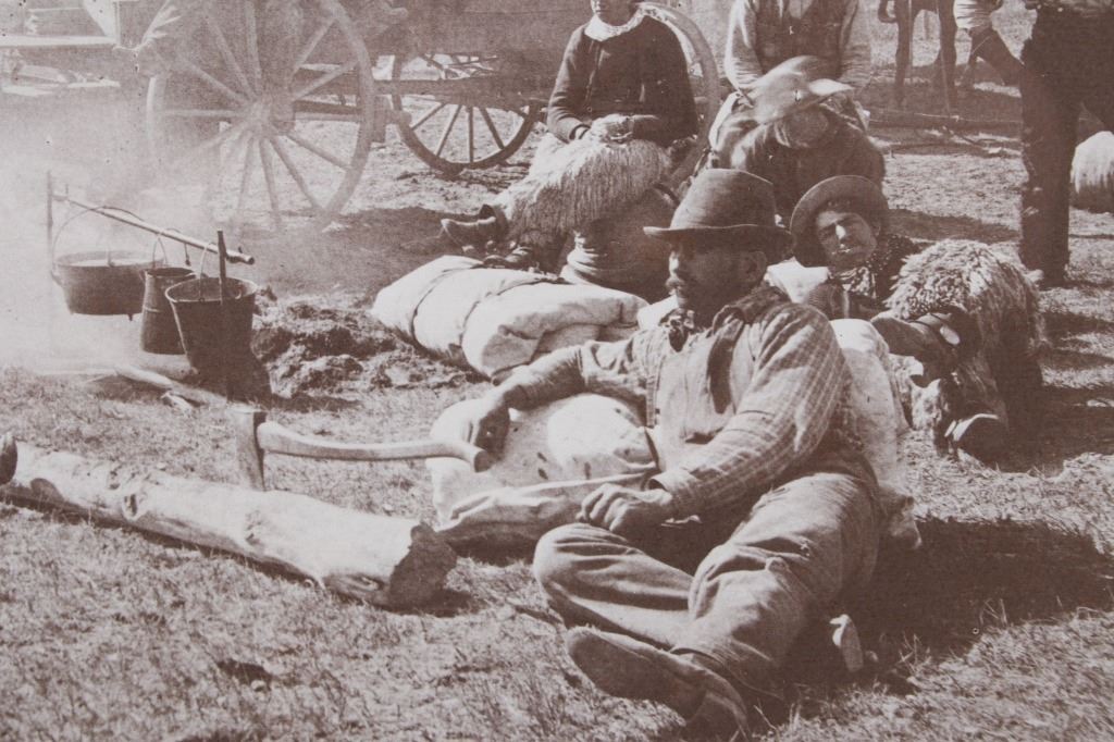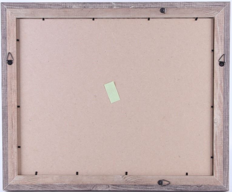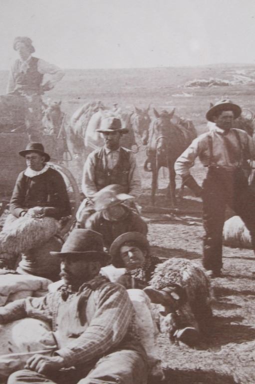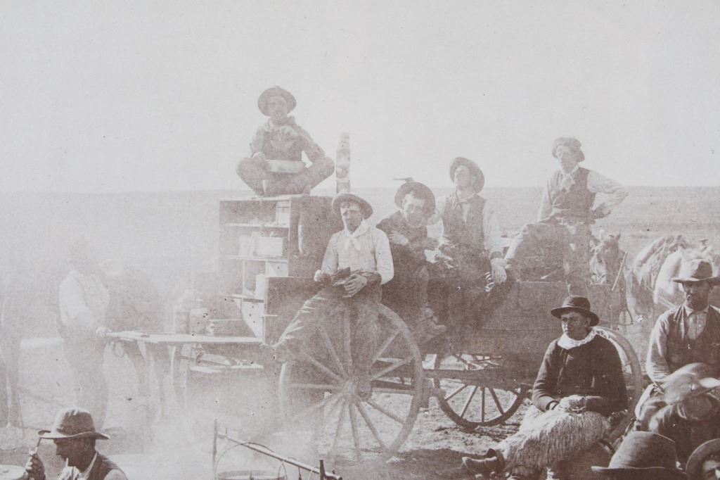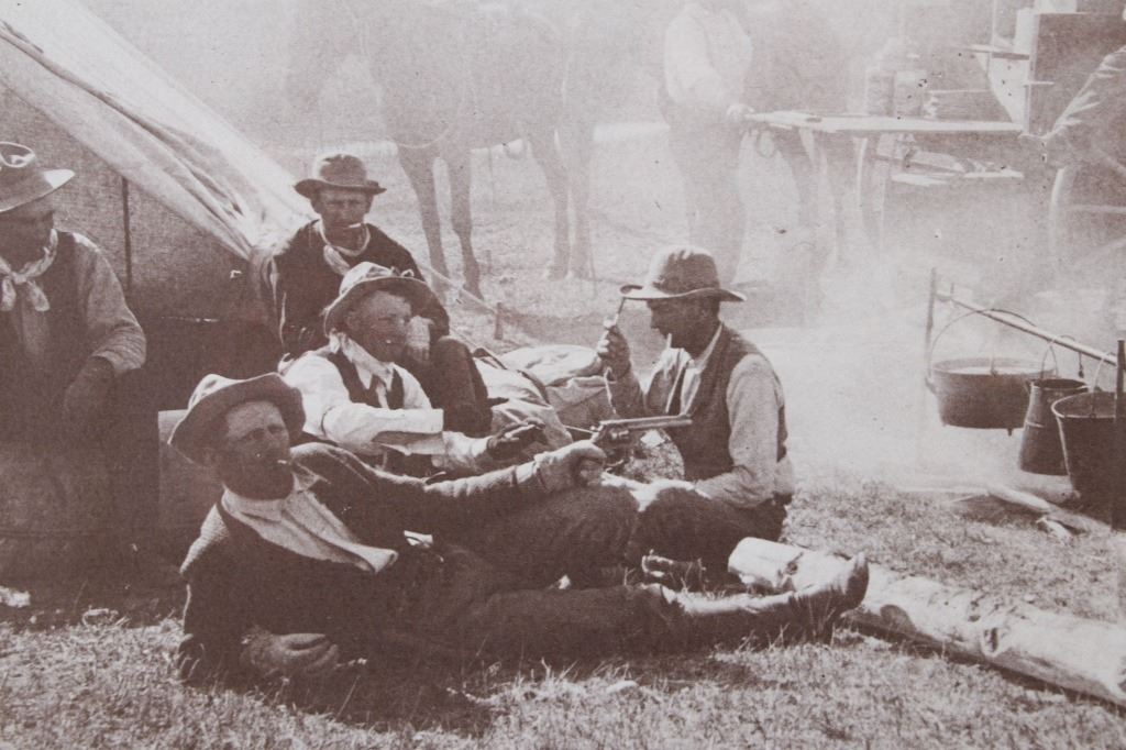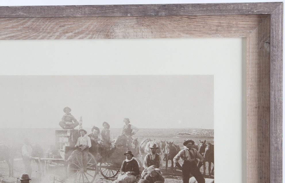 Featured in this lot is this photographic print of "Round-up Cowboys" from the personal collection of J.E. Stimson. The photograph features a wholesome scene of working cowboys taking lunch during a round-up, where they are posing on the chuck wagon beside the fire; one gentleman is showcasing his sidearm and the horses are picketed in the background. The condition of this photograph is good, with no obvious signs of damage to the photo or the frame. The measurements of framed photograph are 19 1/4" x 23 1/4" and the visible art measures 15 1/2" x 19 1/2".