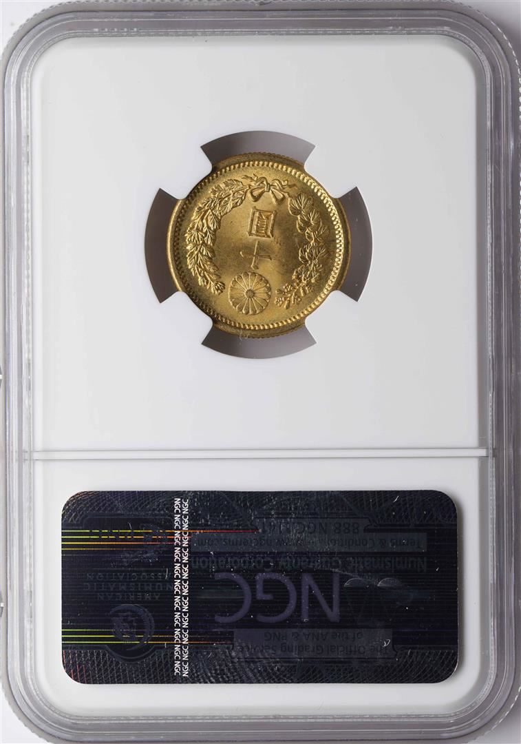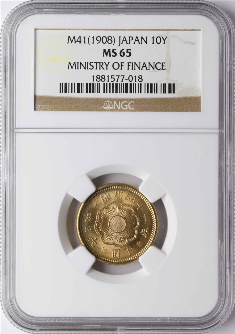 One 1908 M41 Japan 10 Yen Ministry of Finance Gold Coin NGC MS65. NGC Certified.